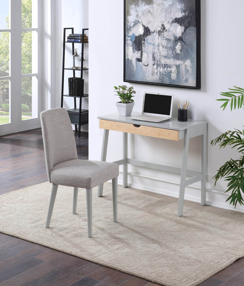 Hilton Desk features solid wood construction with a spacious full-extension drawer and metal glides, offering durable support and easy assembly. Ideal for home office or study spaces, its compact gray design fits efficiently, enhancing organization and productivity.