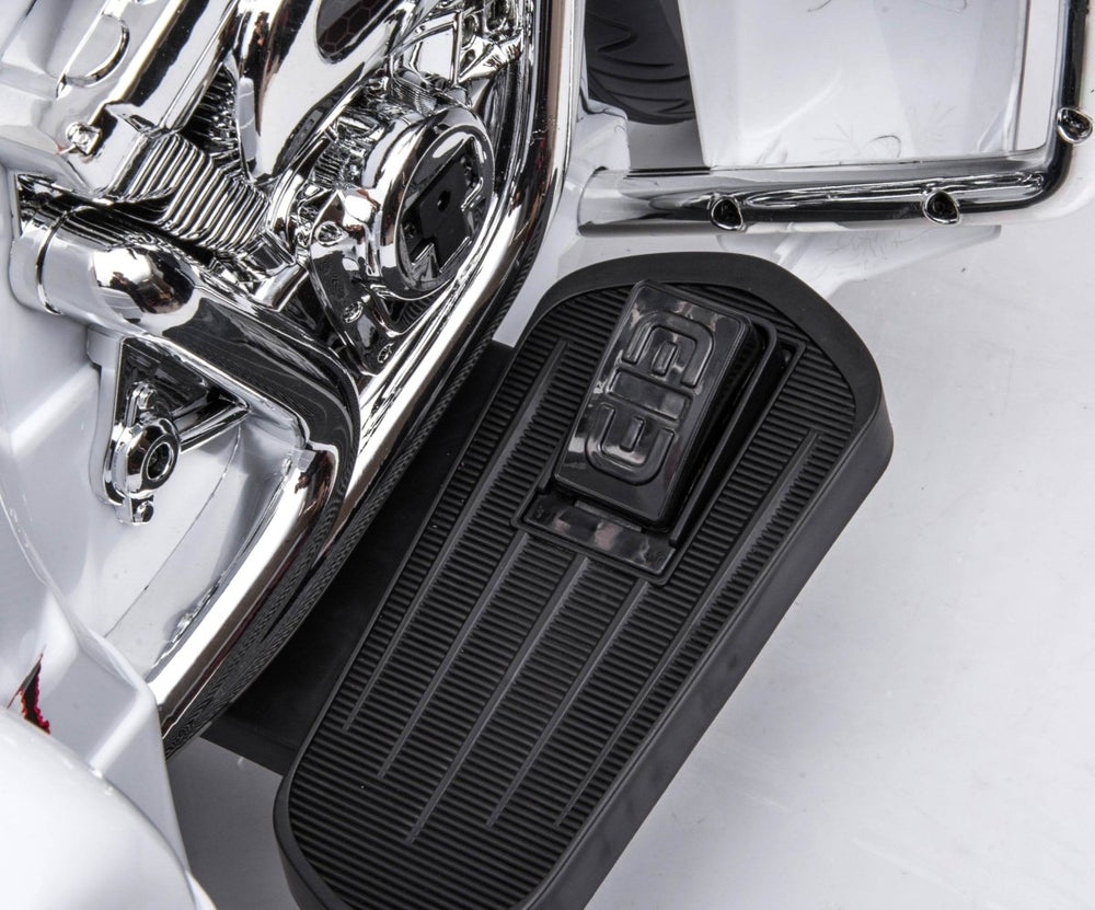 Omega Lifestyles kids electric motorcycle features a stable three-wheel design, two seats for shared rides, built-in music and stories, USB and MP3 connectivity, headlight for night play, and extra-large storage trunk, ideal for indoor and outdoor use for ages 3 to 8.