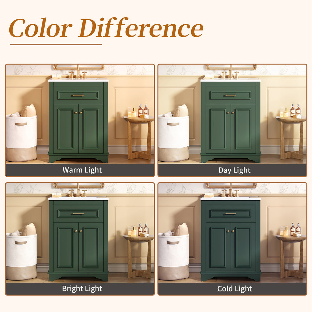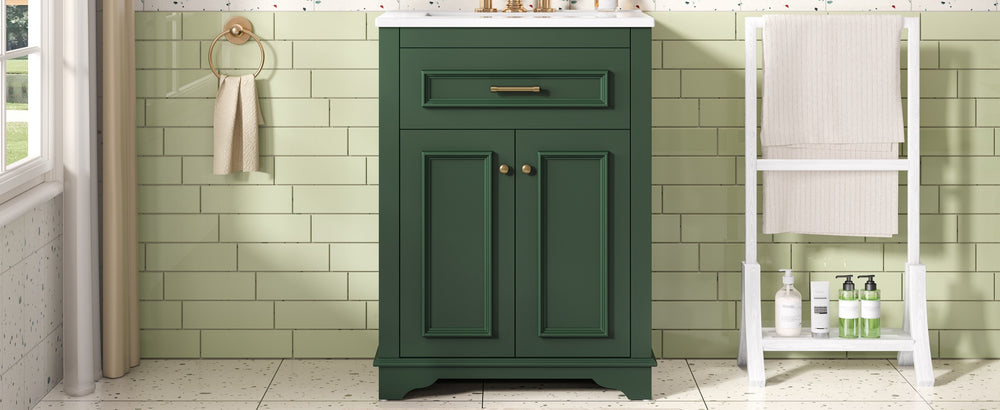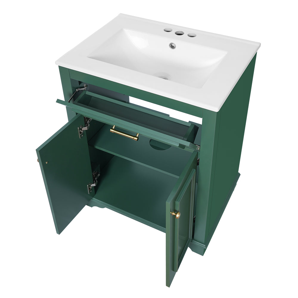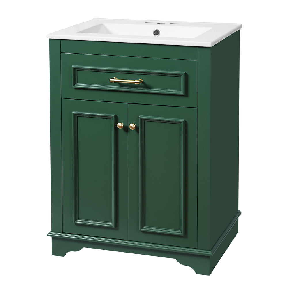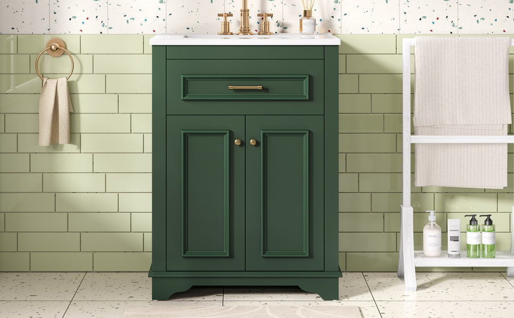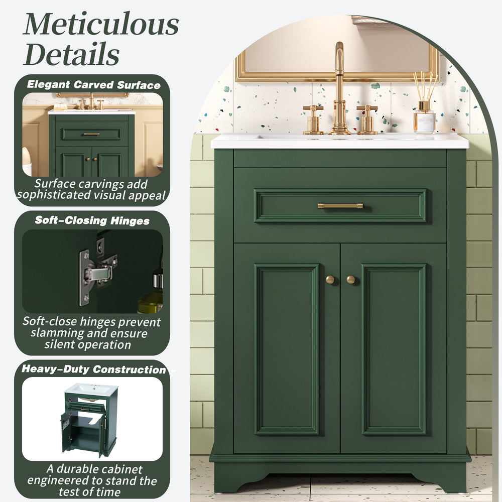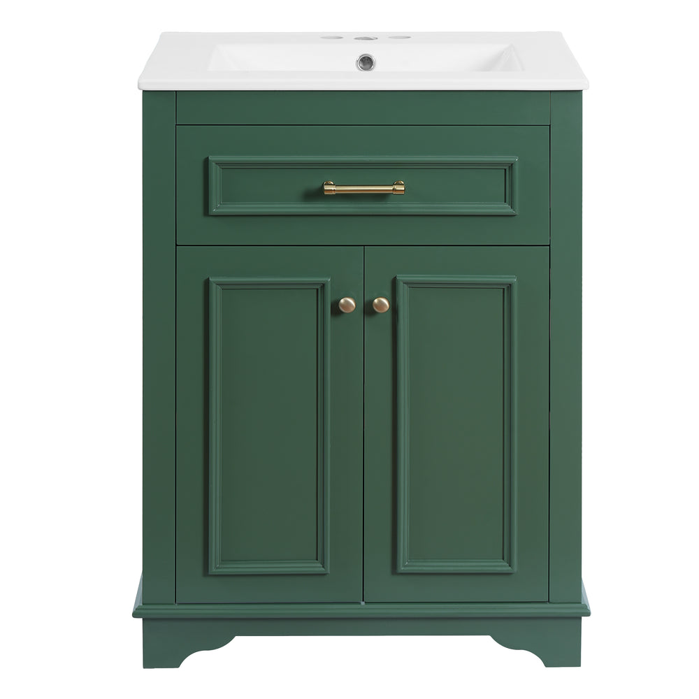 Upgrade your small or medium bathroom with this modern 24-inch bathroom vanity, designed to blend style and functionality seamlessly. The integrated ceramic sink boasts a durable, water-resistant surface that’s easy to clean and resists stains, complemented by a built-in anti-spill overflow for added safety. Crafted from high-quality MDF and iron, the vanity offers lasting stability, while its sleek green finish and polished golden hardware add a sophisticated touch. With a soft-closing door and tip-out drawer, you’ll enjoy quiet, smooth access to ample storage that helps keep your essentials organized and within reach. Its compact footprint fits comfortably in limited spaces without compromising storage capacity. Easy-to-follow assembly instructions make setup hassle-free. Refresh your bathroom with elegance and efficiency—elevate your space today.