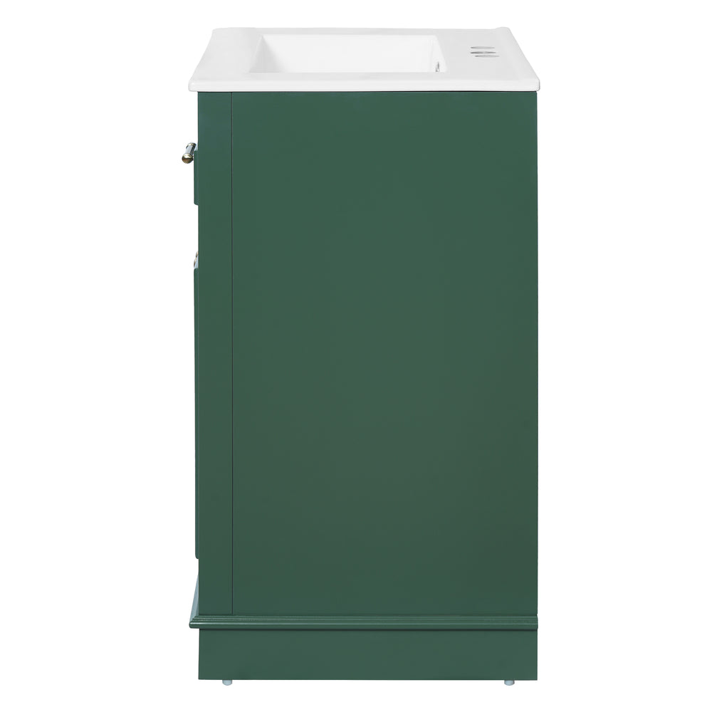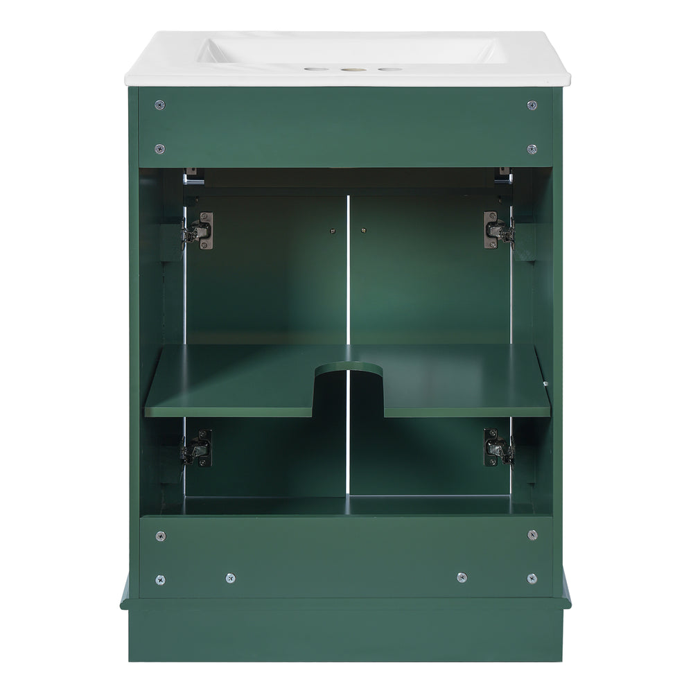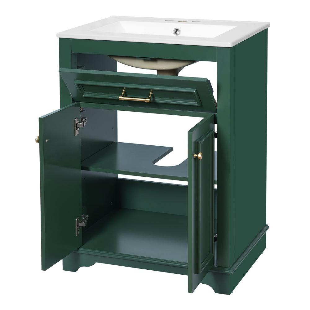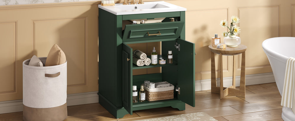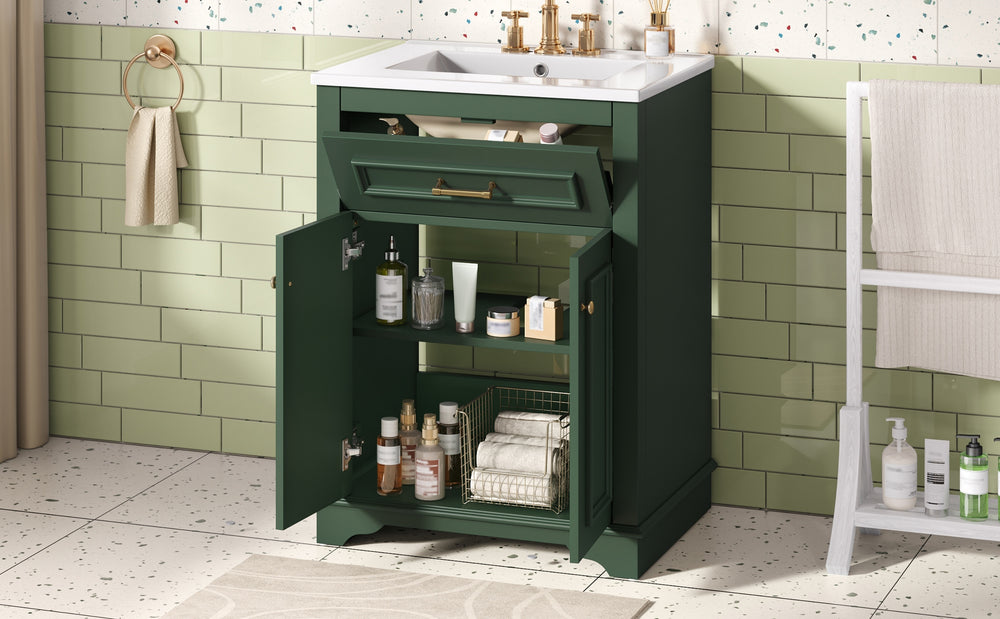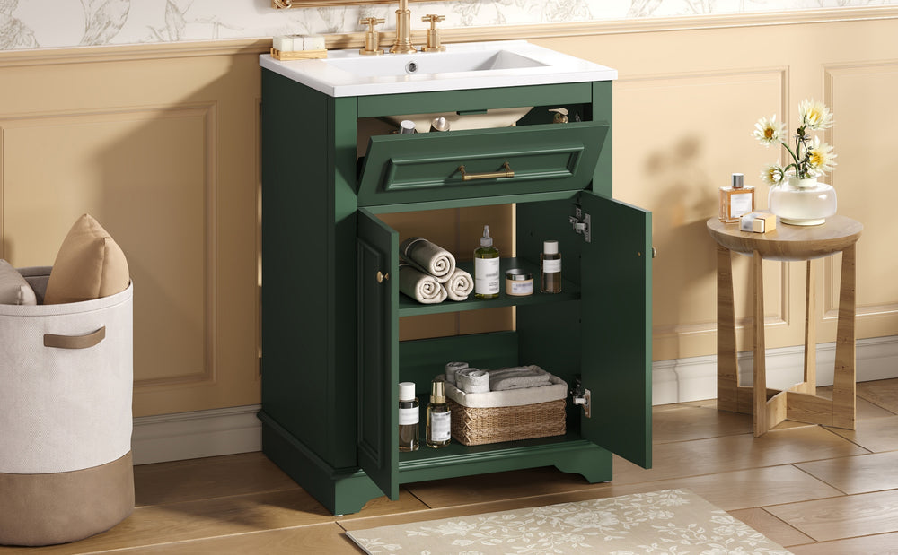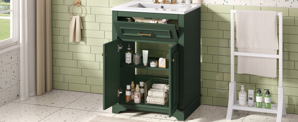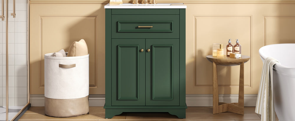 Upgrade your small or medium bathroom with this modern 24-inch bathroom vanity, designed to blend style and functionality seamlessly. The integrated ceramic sink boasts a durable, water-resistant surface that’s easy to clean and resists stains, complemented by a built-in anti-spill overflow for added safety. Crafted from high-quality MDF and iron, the vanity offers lasting stability, while its sleek green finish and polished golden hardware add a sophisticated touch. With a soft-closing door and tip-out drawer, you’ll enjoy quiet, smooth access to ample storage that helps keep your essentials organized and within reach. Its compact footprint fits comfortably in limited spaces without compromising storage capacity. Easy-to-follow assembly instructions make setup hassle-free. Refresh your bathroom with elegance and efficiency—elevate your space today.