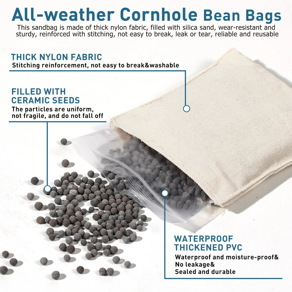 - All-Weather Bean Bags: Includes 8 regulation bags (4 black, 4 white) filled with clay particles.
