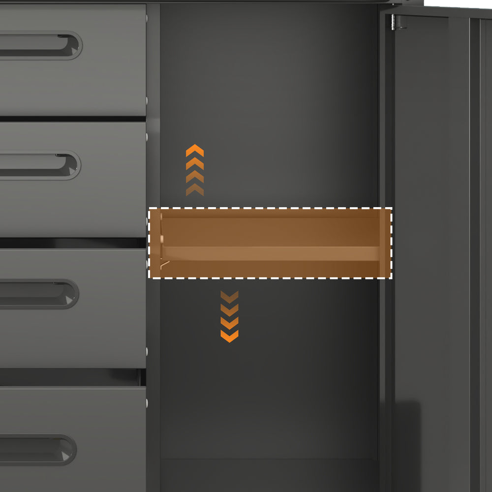 Maximize your garage, office, or workshop organization with this sturdy metal tool storage cabinet. Crafted from cold-rolled steel with a sleek black and gray powder-coated finish, it offers exceptional durability and resistance to daily wear. The compact 29.5" wide by 16.5" deep by 34.6" high design provides ample storage without crowding your space. Featuring four side drawers for precise tool categorization and a lockable storage compartment with adjustable shelves, it keeps your essentials secure and neatly arranged. Equipped with ergonomic handles and 360° lockable caster wheels, it effortlessly moves to wherever you need it while staying firmly in place when locked. The raised top surface prevents items from rolling off, making it an ideal DIY workstation when combined with a wooden board. Simplify your storage today and experience enhanced productivity with this versatile organizer.