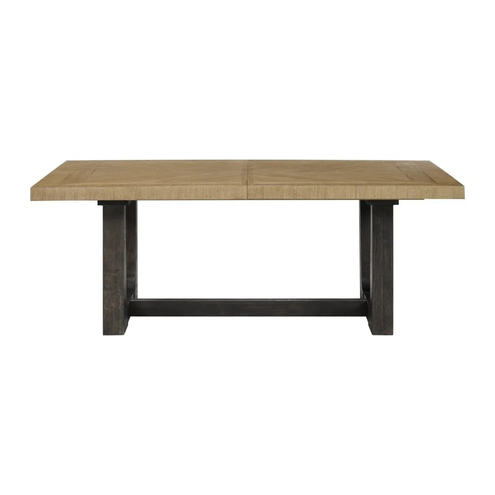 Bring contemporary style and practical functionality to your dining room with this stunning trestle table. Crafted from rich brown wood, the large 104-inch wide surface provides ample space for family meals and entertaining guests. Its sleek black base not only delivers strong stability but also adds a modern contrast to the warm caramel and cocoa tones of the table top. Designed for comfort and versatility, this dining table accommodates standard chairs and features an easy-to-use leaf, allowing you to extend the length effortlessly for larger gatherings. Solid wood construction ensures durability and timeless appeal, making it a centerpiece that will enhance your home for years to come. Welcome family and friends around this elegant and sturdy dining table — elevate your hosting today.
