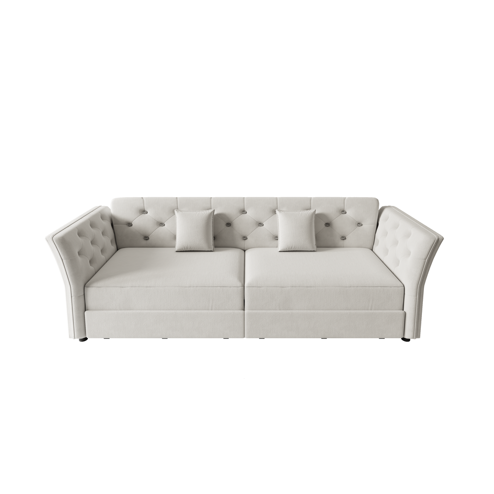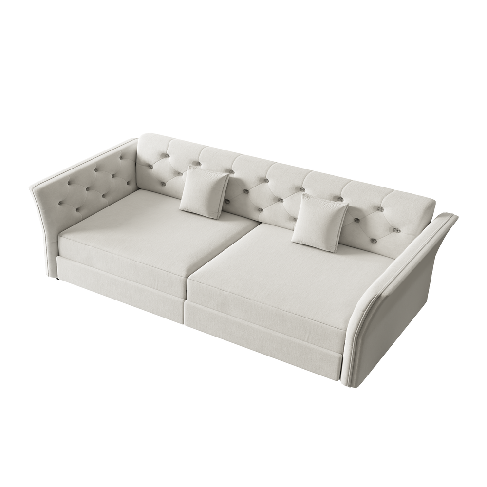 Transform your living space with this elegant 3-seater velvet sofa bed, designed to provide stylish seating and restful sleeping in one compact piece. The handmade fabric flower tufted design adds artistic flair and inviting texture, while the soft velvet upholstery delivers a plush, touchable surface that brightens any room. Built on a sturdy wood and iron frame, this sofa offers lasting durability and reliable support for everyday use. Easily convert it into a queen-size sleeper bed measuring 59.8” wide by 78.7” long and 12.6” high, perfect for accommodating guests or maximizing small apartments. Removable cushions and backrest covers simplify cleaning and maintenance, keeping your sofa fresh and vibrant. Whether for the living room, bedroom, or apartment, enjoy deep-seated comfort and charming style. Elevate your home’s functionality and ambiance today.