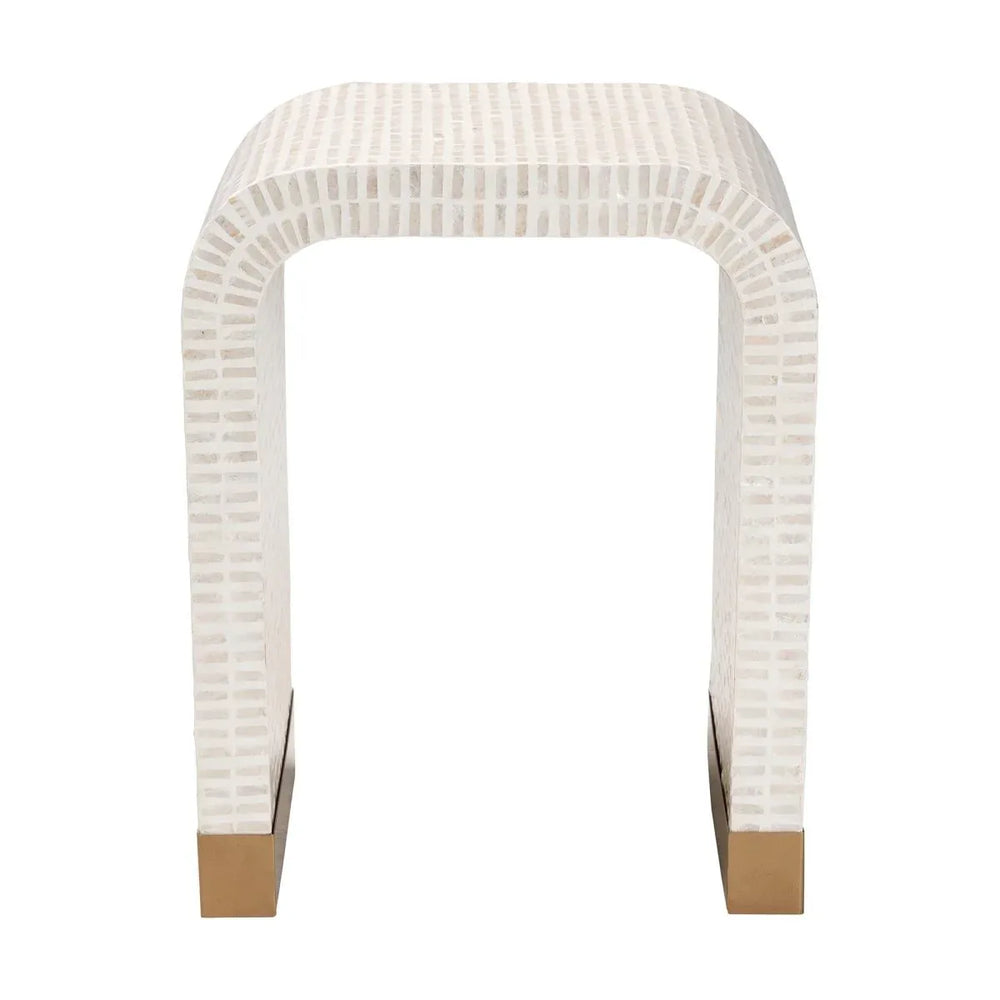 Omega Lifestyles coastal end table features a mosaic Capiz shell pattern and waterfall silhouette, crafted from engineered wood, metal, and Capiz shell. Its rectangular tabletop offers versatile storage, enhancing living spaces with coastal-inspired style and functionality.