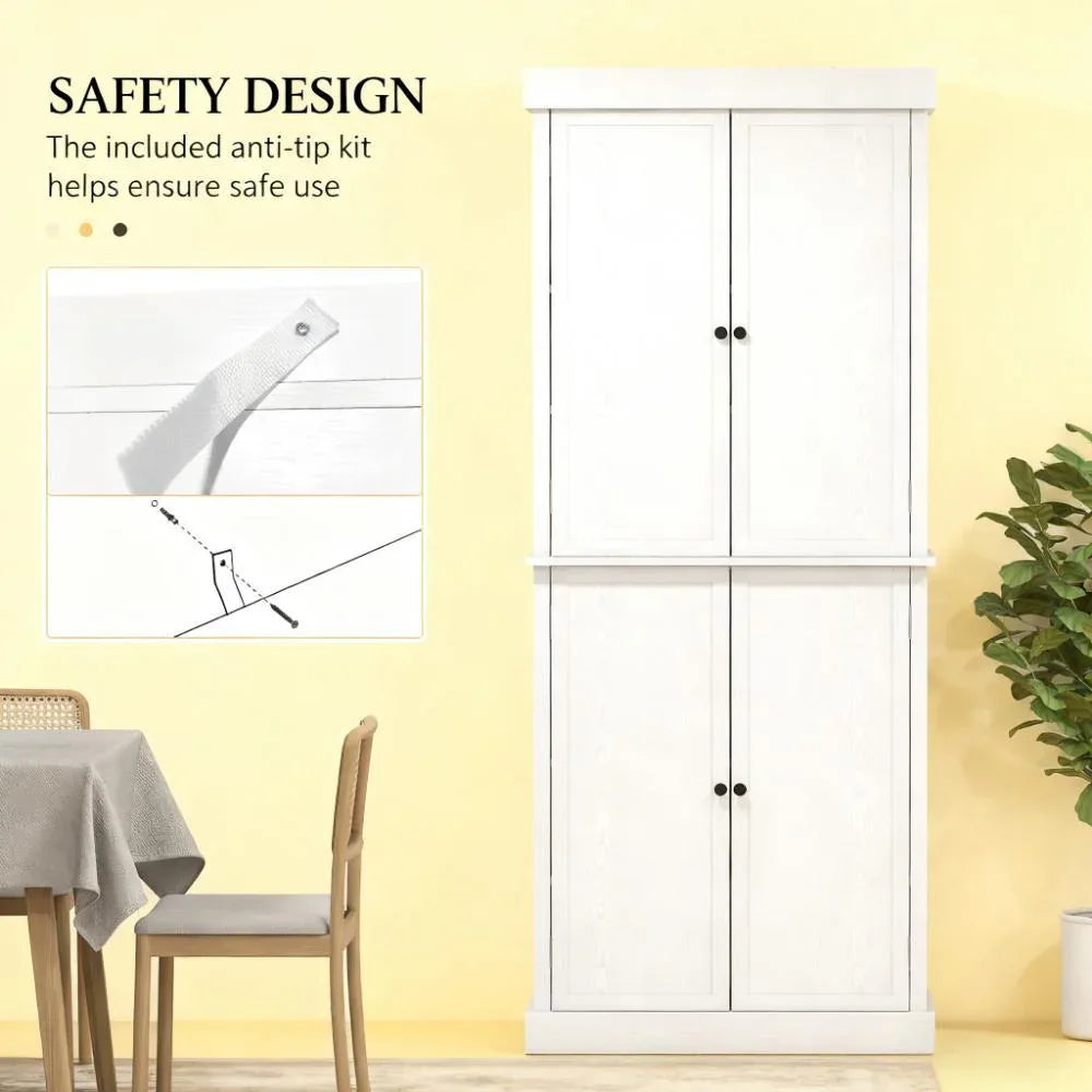 Organize your kitchen or home effortlessly with this stylish white pantry cabinet featuring a modern shaker-style design. Its six-tier shelving system offers ample space to store dishes, cookware, small appliances, and dry goods, keeping everything neat and accessible. Two shelves are fixed, while two others are adjustable across three levels, allowing you to customize storage for items of different sizes or remove shelves to create a large display area. Four magnetically latched doors keep your contents dust-free and securely enclosed. Crafted from durable particleboard and MDF, this tall 72.5-inch cabinet blends functionality with a clean look that complements any kitchen, dining room, or home office. Anti-tipping straps provide added safety by securing the cabinet to your wall. Easy to assemble and designed for lasting use, this pantry cabinet is a versatile storage solution that enhances your space. Elevate your organization today.