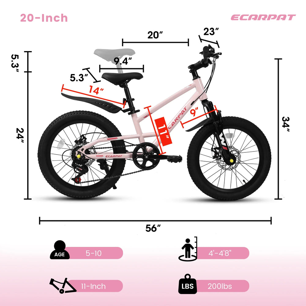 Perfectly designed for boys and girls ages 6 to 12, this 20-inch mountain kids bike combines safety, style, and performance to inspire young riders outdoors. Built with a durable carbon steel frame and equipped with front suspension, it absorbs bumps for a smooth ride on trails and streets alike. The 7-speed drivetrain with thumb shifters empowers kids to easily tackle different terrains confidently, fostering independence and fun. Front disc brakes provide reliable stopping power for greater control and safety. Sized for riders between 48 and 55 inches in height and supporting up to 150 pounds, this bike features puncture-resistant 20 x 2.125-inch tires to keep kids rolling without worry. With 85% pre-assembly, setup is quick so little adventurers can hit the road fast. Let your child enjoy outdoor freedom and develop skills with this thoughtfully engineered mountain bike. Elevate their riding experience today!