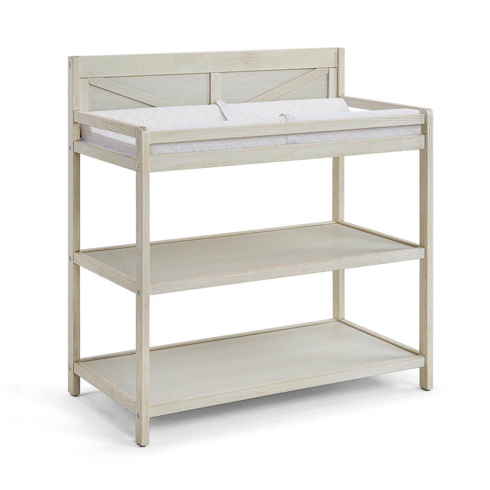 The Barnside Changing Table in washed gray offers a perfect blend of functionality and timeless design for your nursery. Crafted from solid wood, this sturdy changing table provides a secure and comfortable space for diaper changes and dressing your baby. Featuring safety rails on all four sides, it ensures added protection while you care for your little one. Its two spacious shelves offer convenient storage for diapers, wipes, and essentials, keeping everything within easy reach. When your child grows, this versatile piece easily converts into a bookcase or toy shelf, extending its use beyond infancy. The non-toxic, nursery-safe finish prioritizes your baby’s health, and rigorous safety certifications guarantee peace of mind. Compact yet practical, it fits seamlessly in most nursery layouts at 36 inches long, 19.25 inches wide, and nearly 40 inches high. Elevate your baby’s care routine with quality and safety that lasts.