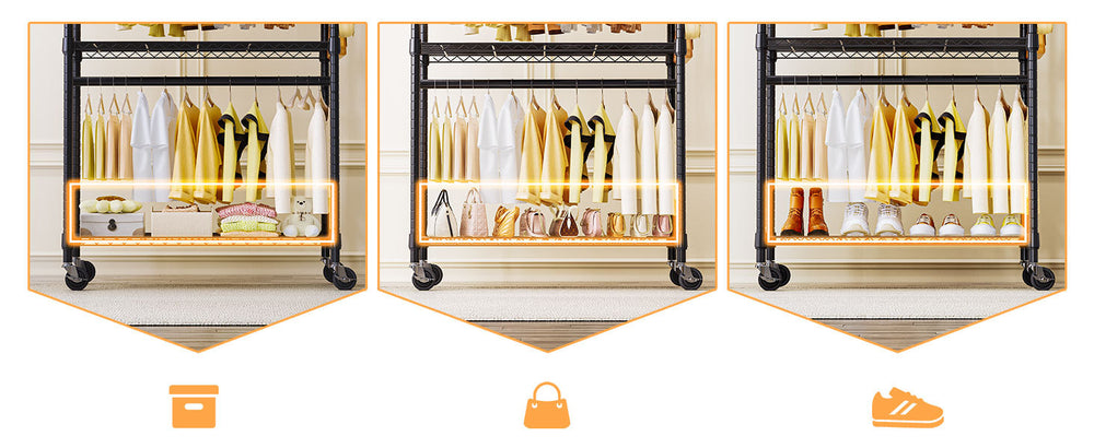 Maximize your closet space and streamline your clothing storage with this modern, heavy-duty rolling garment rack. Crafted from premium carbon steel with a sturdy 22.2 mm steel tubing, this rack offers exceptional durability and rust resistance for long-lasting use. Featuring three adjustable wire shelving tiers, two rods, and convenient side hooks, it provides versatile storage options for clothes, shoes, accessories, and more. The lockable 360° heavy-duty wheels allow smooth mobility across rooms while ensuring stability when locked. With a compact footprint of 29.5 inches wide by 15.7 inches deep and a towering 74.5 inches high, it fits perfectly in bedrooms, closets, or laundry rooms. Whether for home or commercial use, this rolling clothes rack supports up to 750 pounds when stationary and around 300-350 pounds on wheels. Elevate your storage solution and keep your wardrobe organized and accessible with ease.