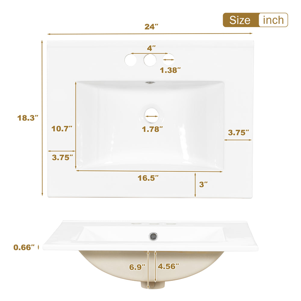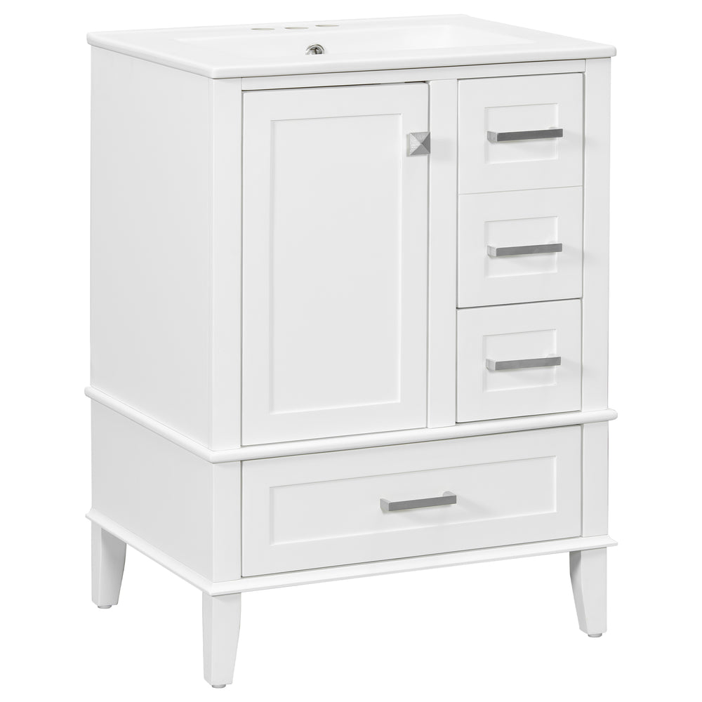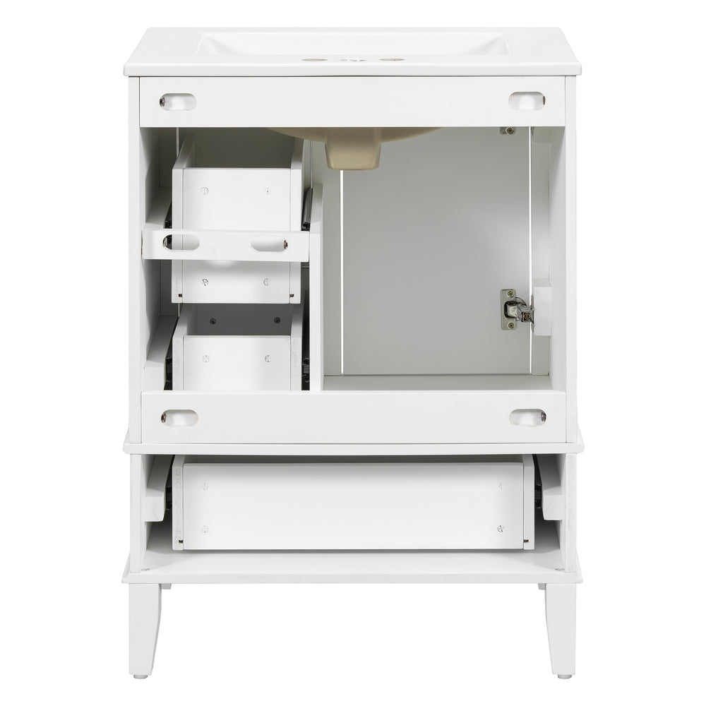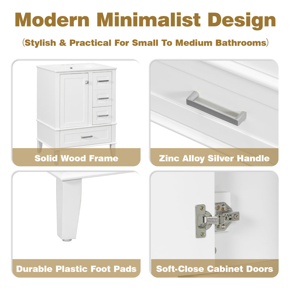 Upgrade your bathroom space with this sleek 24.8-inch modern vanity, expertly designed to combine style and functionality. The solid wood and MDF frame ensures lasting durability, while the pristine white painted finish adds a fresh, elegant touch to any bathroom. Equipped with a durable ceramic sink that’s stain-resistant and easy to clean, this vanity supports daily use with grace. Soft-close doors and multi-sized drawers provide quiet operation and versatile storage for toiletries, towels, and accessories. Its compact dimensions offer a perfect fit for small to medium bathrooms without sacrificing organization or style. The open-back design allows improved plumbing access and ventilation, keeping your space neat and fresh. Elevate your bathroom’s look and convenience today.