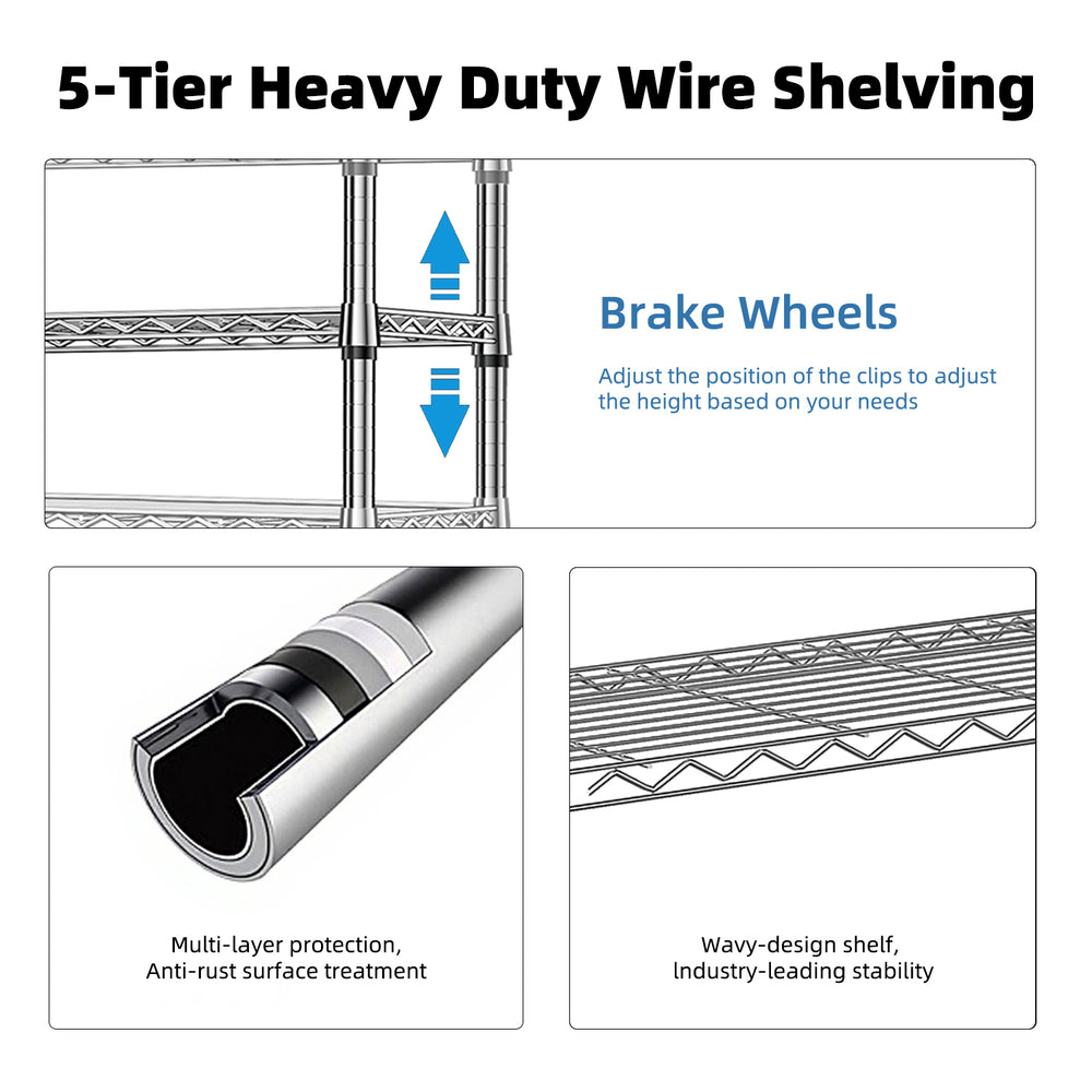Organize your space effortlessly with this durable 5-tier utility shelving unit, crafted from tough carbon steel with a sleek chrome finish. Designed for heavy duty use, it supports up to 1,250 pounds total, making it perfect for home, kitchen, office, or garage storage. Adjustable shelves offer versatile height options to fit everything from gym equipment to kitchen supplies, while the vertical design maximizes space without cluttering your area. Easy, tool-free assembly means you’ll spend less time setting up and more time enjoying a tidy, efficient space. Whether you need a reliable wire rack for bulky items or a minimalist steel organizer, this shelving unit is a practical solution that blends strength with style. Elevate your storage and streamline your environment today.
