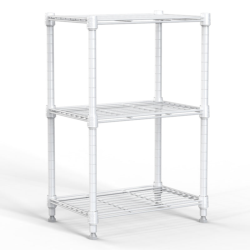 Carbon steel 3-tier wire shelving offers durable, adjustable vertical shelves supporting up to 150 lbs each, ideal for gym, kitchen, or office storage. Its classic white finish and tool-free assembly provide flexible, stable organization in compact spaces.