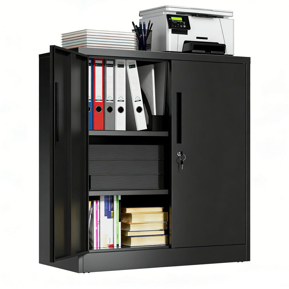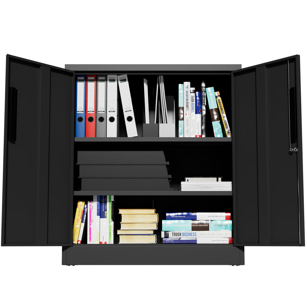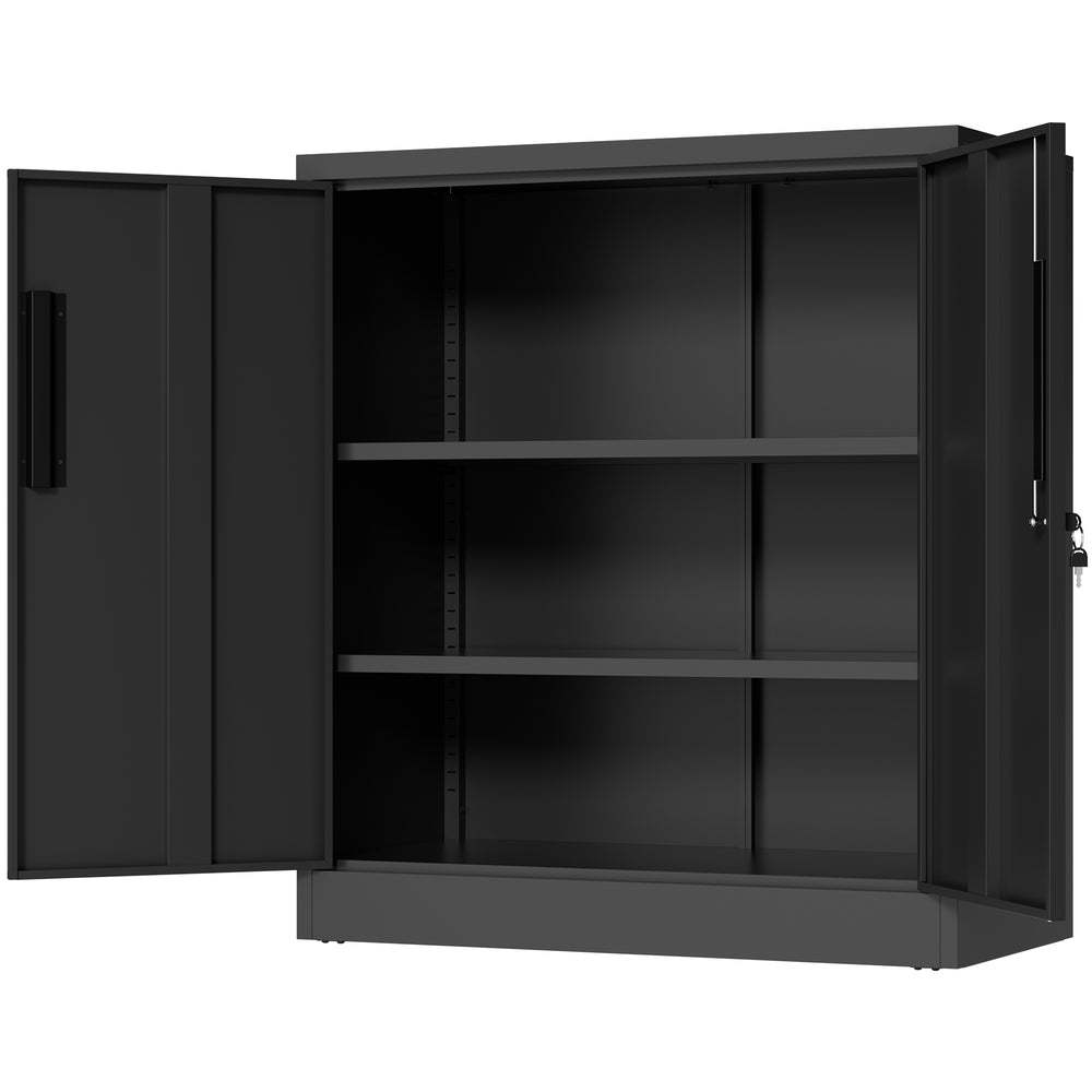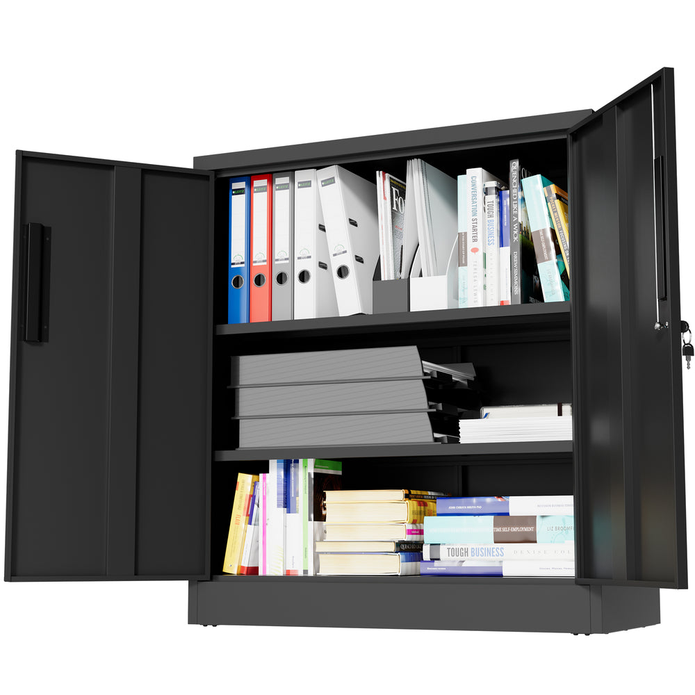 Modern black metal storage cabinet with 2 adjustable heavy-duty shelves supporting up to 150 lbs each, featuring a secure 3-point locking system and anti-tip design. Ideal for organizing office files, tools, or household items with durable, scratch-resistant protection.
