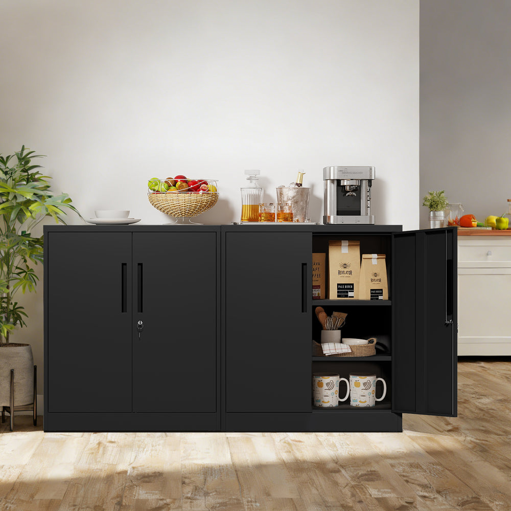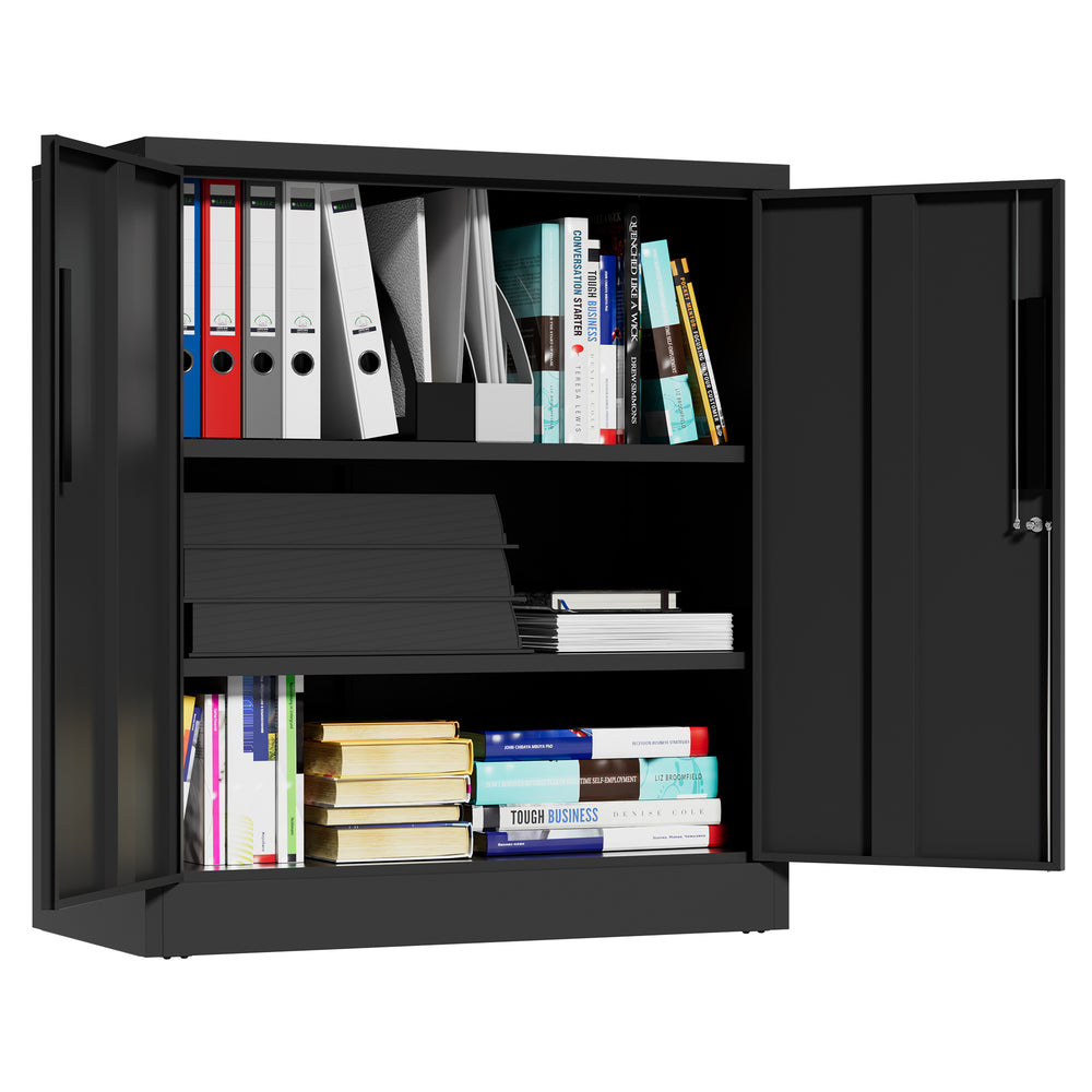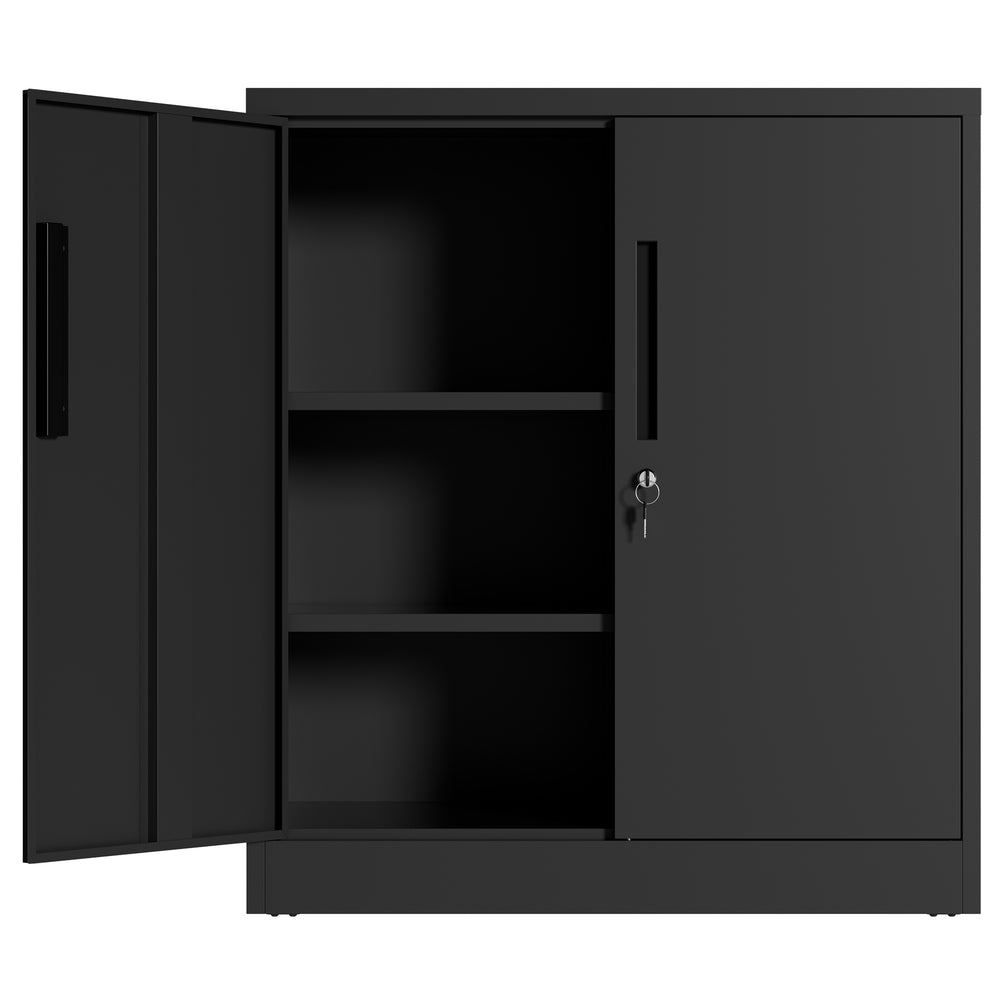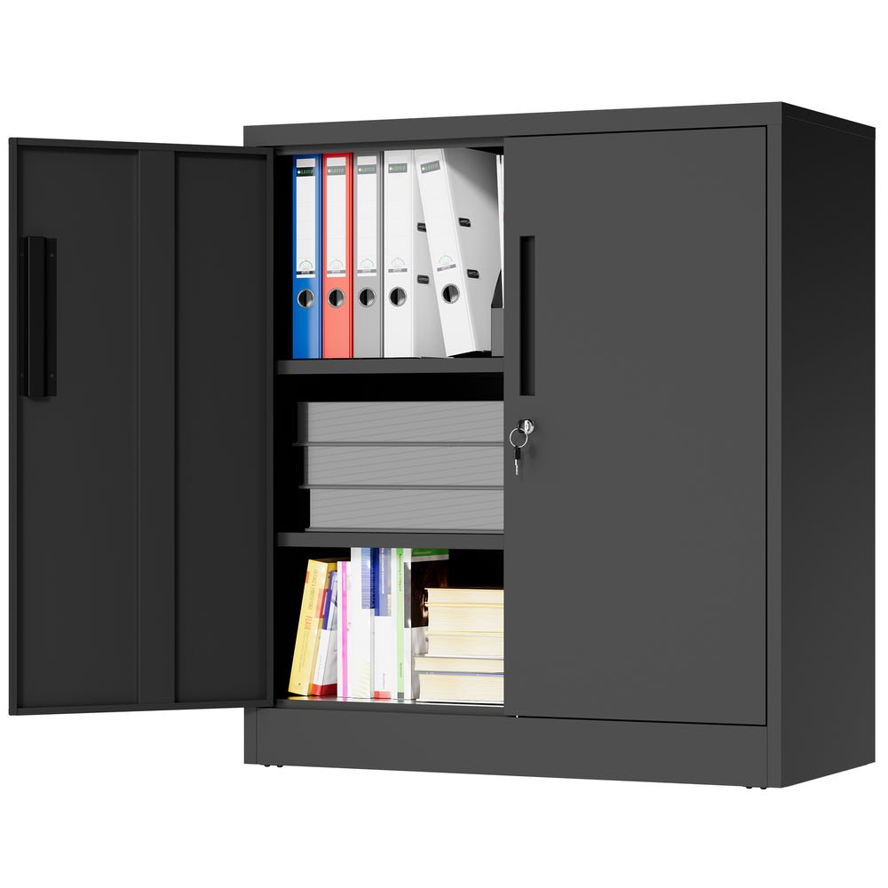Modern black metal storage cabinet with 2 adjustable heavy-duty shelves supporting up to 150 lbs each, featuring a secure 3-point locking system and anti-tip design. Ideal for organizing office files, tools, or household items with durable, scratch-resistant protection.