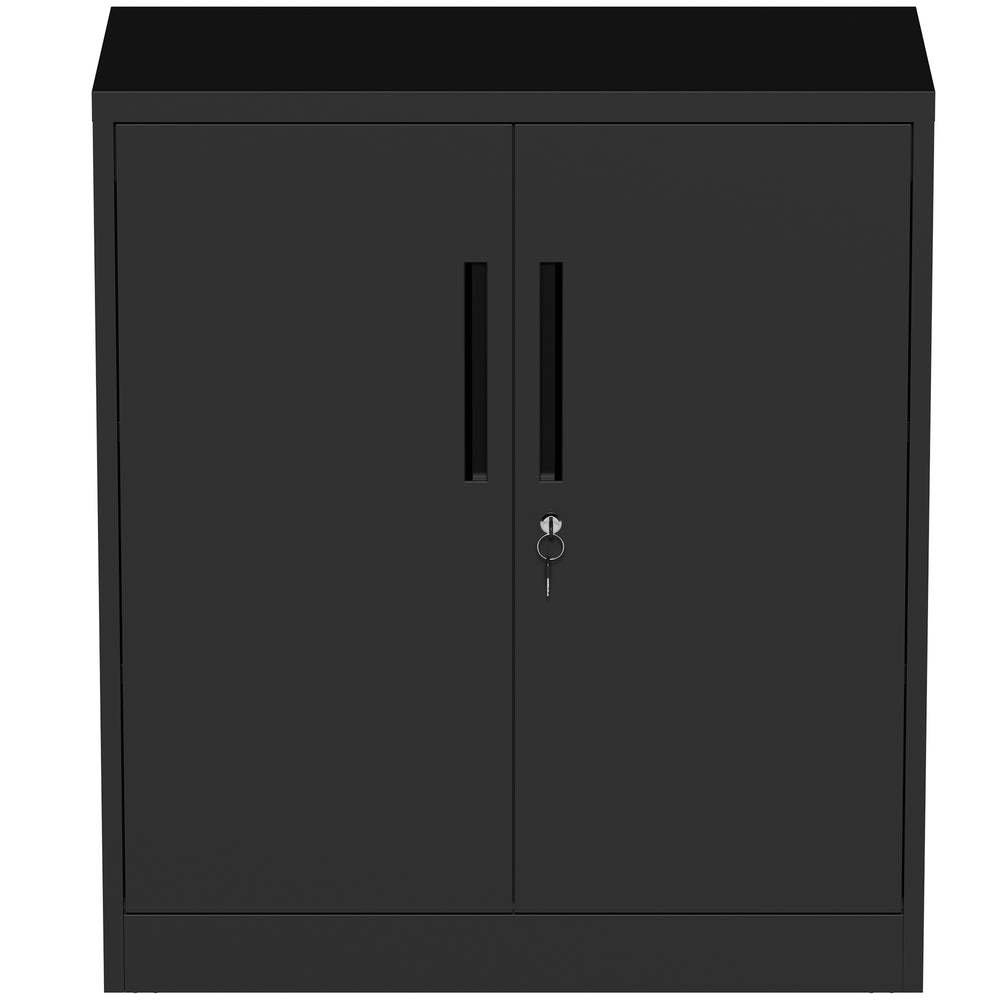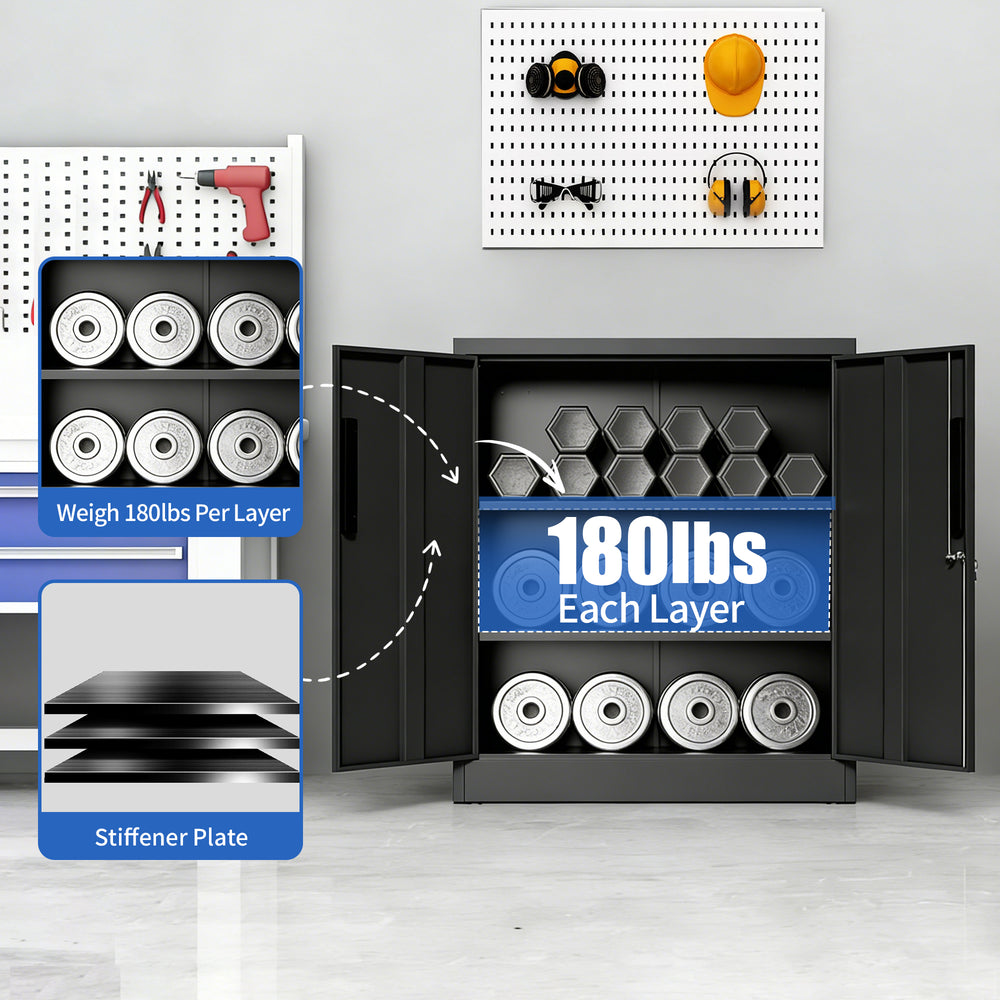 Maximize your storage efficiency with this modern black metal storage cabinet, crafted for durability and versatility in any environment. Featuring two adjustable shelves that support up to 150 lbs each, it easily adapts to hold heavy tools, office files, or household items. The robust metal construction with a powder-coated finish offers excellent scratch and rust resistance, ensuring lasting use. A 3-point locking system with magnetic door closure protects your valuables, making this cabinet ideal for garages, offices, homes, and schools. With practical dimensions of 31.4 inches wide by 15.7 inches deep and 35.4 inches tall, it fits neatly into tight spaces while providing generous storage. Thoughtfully designed for quick assembly and enhanced safety with an anti-tip device, this freestanding cabinet transforms cluttered areas into organized, secure spaces. Elevate your workspace or home organization today.