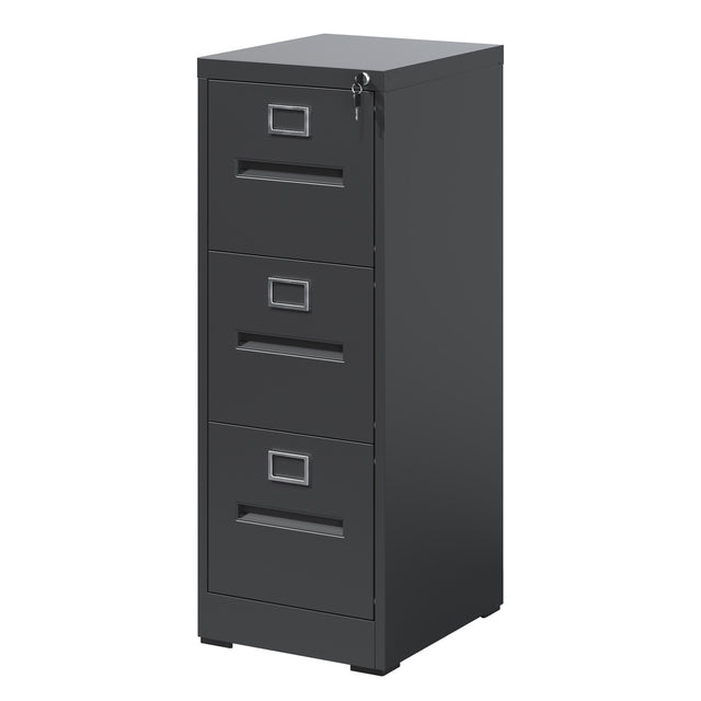 Organize your important documents effortlessly with this sleek black steel filing cabinet designed for office and home use. Featuring three spacious drawers with adjustable hanging rods, it efficiently stores A4, Letter, and Legal size files, keeping your workspace tidy and clutter-free. Crafted from high-quality cold-rolled steel with a powder-coated finish, this file cabinet is durable, waterproof, and easy to clean, ensuring long-lasting performance. The integrated lock system secures all drawers simultaneously, while the anti-tilt mechanism guarantees safe operation. With smooth ball bearing drawer slides and an ergonomic extra-long handle design, access is both quiet and effortless. Easy to assemble with included instructions and QR code video, this cabinet blends modern style with reliable functionality. Elevate your office organization today.