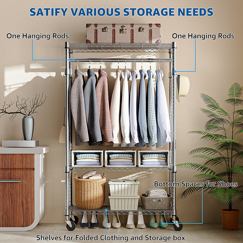 • Adjustable 3-Tier Wire Shelving: Customize height to fit shoes, folded clothes, and hanging items