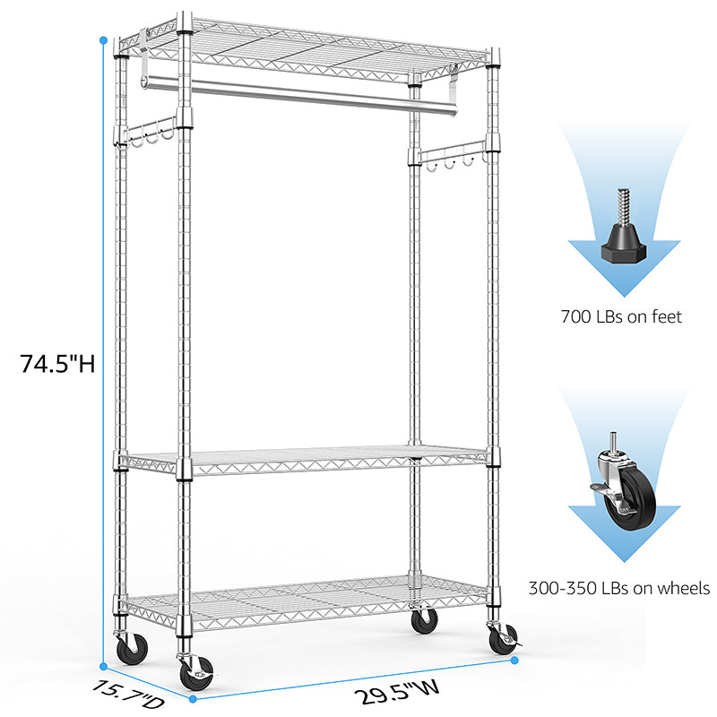 Organize your wardrobe effortlessly with this heavy duty rolling garment rack featuring three adjustable wire shelving tiers. Crafted from sturdy carbon steel with a modern chrome finish, it offers exceptional durability and rust resistance. The spacious design measures 29.5 inches wide, 15.7 inches deep, and 74.5 inches tall, providing ample space for hanging clothes, folded items, and shoes. Equipped with one hanging rod and two sets of side hooks, the adjustable tiers adapt to your storage needs. Four lockable 360° wheels provide smooth mobility, allowing you to easily move it between rooms or lock it securely in place. This versatile clothes rack is perfect for bedrooms, closets, laundry rooms, or garages. Easy to assemble and built to support heavy loads, it’s the ideal solution to keep your clothing organized and accessible. Elevate your wardrobe storage today.