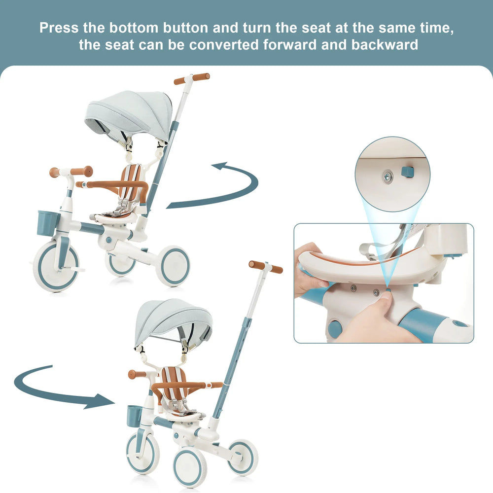 7-in-1 Multifunctional Design: Tricycle, Push Trike, Balance Bike, Canopy Use
