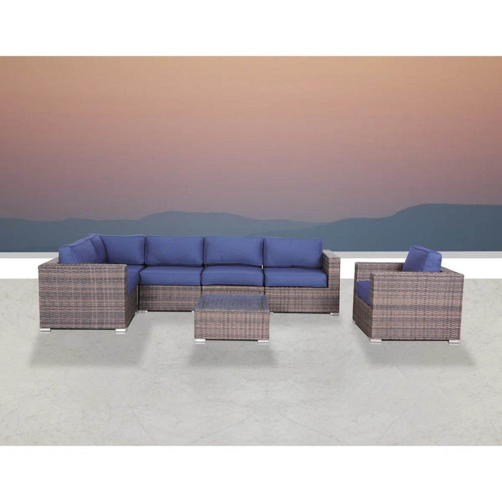7-piece rattan patio sectional with weather-resistant aluminum frame and HDPE wicker offers durable outdoor seating for five. Includes navy blue water- and UV-resistant foam cushions, tempered glass coffee table, and modular design for effortless relaxation and entertaining.