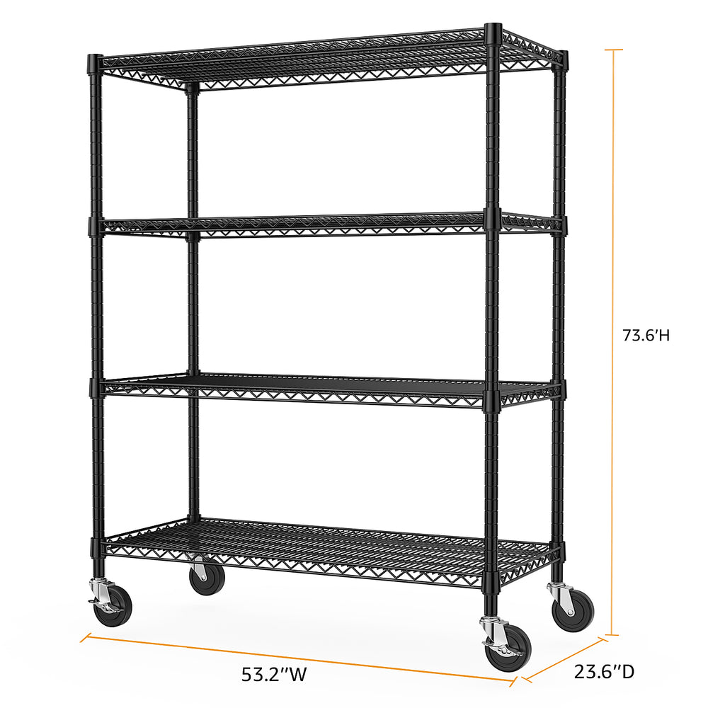 Upgrade your garage, pantry, or warehouse organization with this heavy-duty industrial metal shelving unit. Crafted from robust carbon steel and reinforced with 1-inch (25.4 mm) metal rods, it delivers exceptional strength, holding up to 440 lbs per shelf on leveling feet. The 4-tier design offers ample vertical storage while maintaining a compact footprint of 73.6 inches long by 53.2 inches wide and 23.6 inches high, fitting seamlessly in tight spaces. Adjustable shelves provide customizable height options to suit various storage needs, while four 360° swivel wheels add effortless mobility, letting you rearrange your space with ease. The waterproof black coating enhances durability and keeps your shelving looking sharp under all conditions. This minimalist shelving rack is ideal for gym, basement, or utility room storage. Elevate your organization and create a clutter-free environment today.