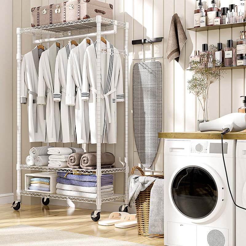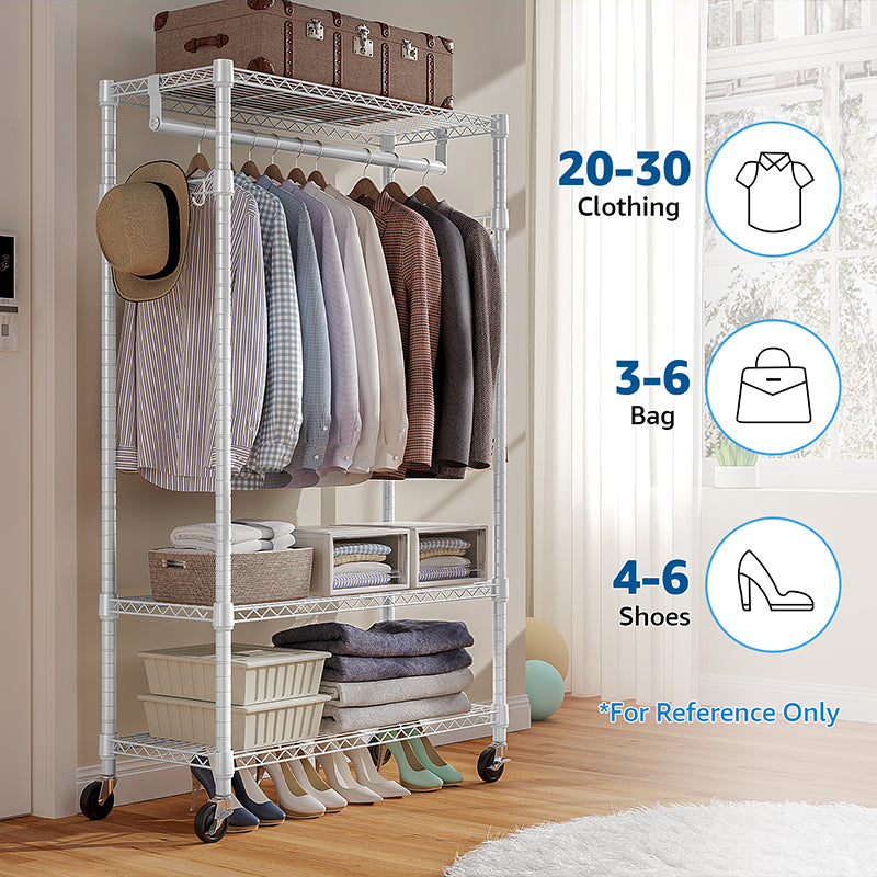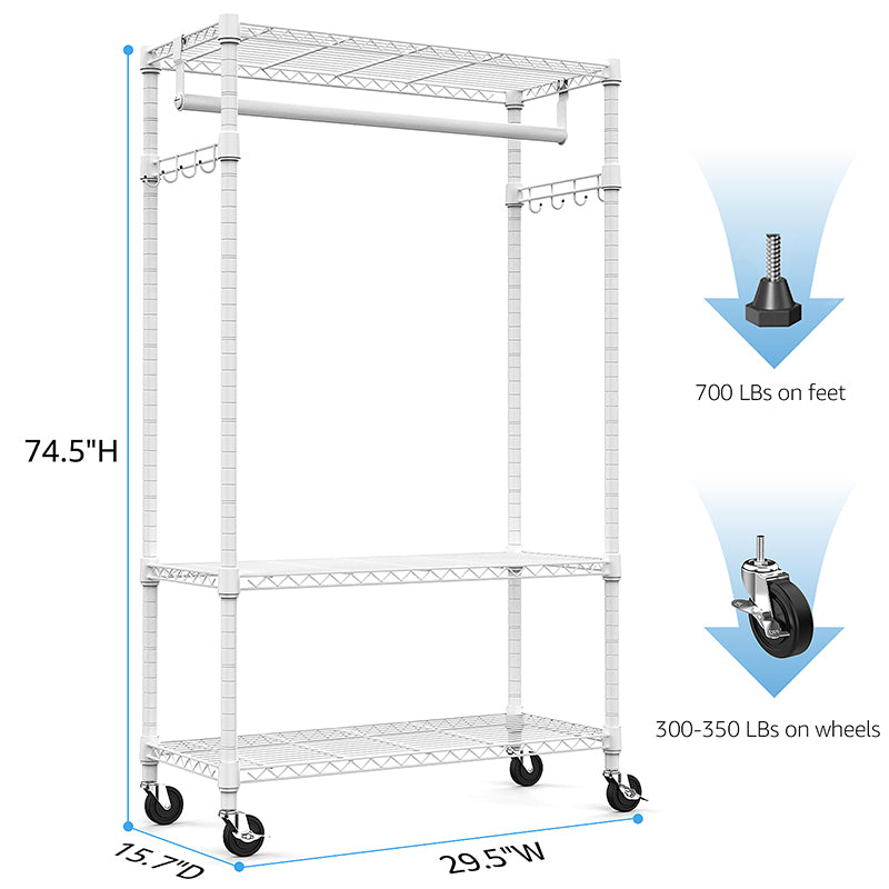 Maximize your bedroom or closet space with this heavy duty rolling garment rack, designed to handle large loads while keeping your clothes accessible and neat. Crafted from durable carbon steel with a rust-resistant finish, it supports up to 750 pounds when stationary and 300-350 pounds on its smooth-rolling wheels. The spacious dimensions—29.5 inches wide, 15.7 inches deep, and 74.5 inches tall—offer ample storage for hanging garments, folded items, and shoes. Adjustable shelves and side hooks allow you to customize the rack height for versatile storage needs. With its modern white finish and lockable 360° wheels, this garment rack is as mobile as it is sturdy, making it perfect for bedrooms, laundry rooms, garages, or closets. Easy to assemble and built to last, this rolling clothes rack brings organization and style to your space. Elevate your storage solution today.