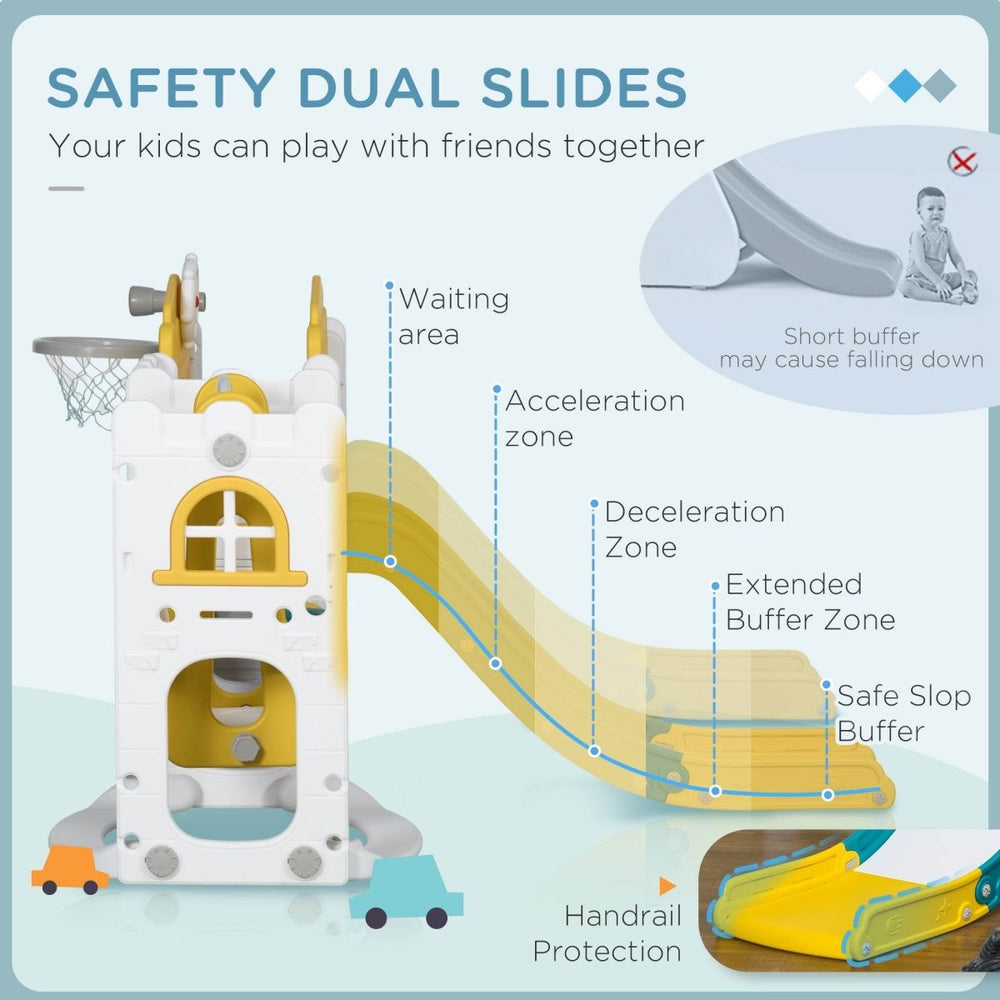 Designed for toddlers ages 1-3, this vibrant yellow indoor playground combines fun, safety, and creativity in one dynamic playset. Made from durable, high-quality plastic, it features two slides with carefully engineered acceleration and deceleration zones to ensure a safe and thrilling experience. The swing and climber encourage active play, while interactive elements like a spinning steering wheel, telescope, and basketball hoop help develop motor skills and spark imaginative adventures. With a spacious aisle and convenient storage area, this toddler slide and swing set offers endless entertainment that grows with your child. Its sturdy base can be reinforced with sand or water for extra stability, making it a reliable addition to any playroom or indoor space. At 98.4 inches long by 69.7 inches wide and standing 39 inches tall, this playset fits comfortably indoors while offering plenty of room to explore. Elevate your toddler’s playtime today with a versatile, safe, and engaging playground designed to inspire joy and confidence.