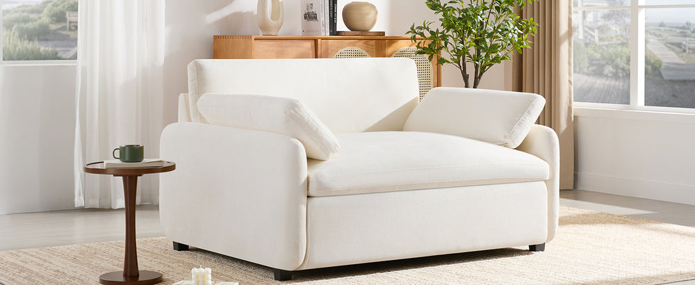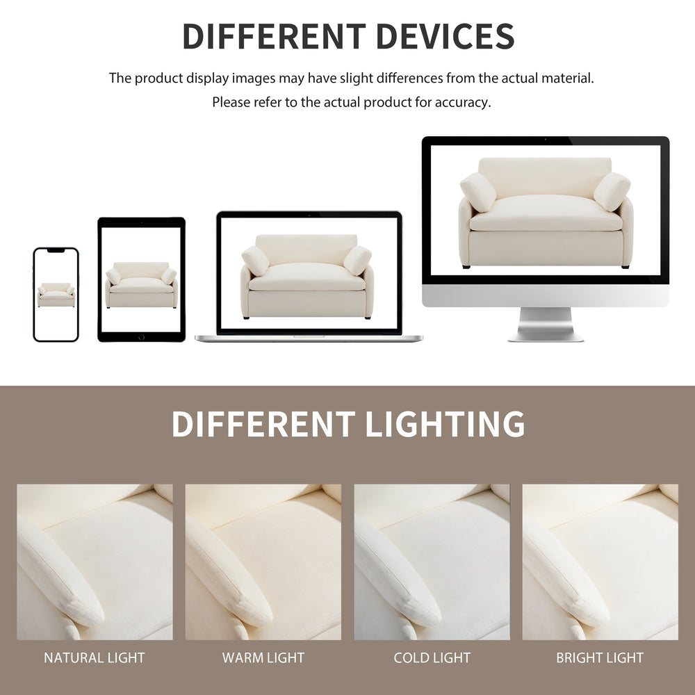 Relax in style with this spacious 50-inch by 43-inch single sofa chair, designed to offer an immersive seating experience. Upholstered in soft, creamy chenille fabric, this modern armchair provides cloud-like comfort through a high-density foam and PP cotton blend. The wide and deep seat lets you lounge cross-legged, recline sideways, or stretch out fully, transforming any living room or apartment space into a cozy retreat. Featuring a sturdy wood and plywood frame with sleek plastic legs, it combines durability with practical simplicity. Included armrest pillows add extra support, making this chair a perfect blend of luxury and function. Elevate your living area with this versatile, comfy accent chair today.