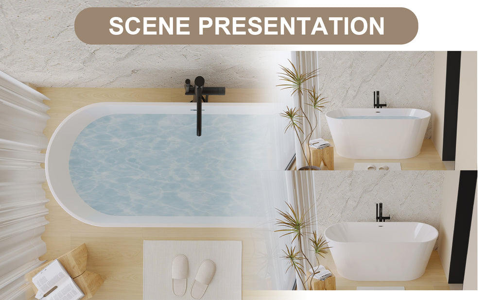Transform your bathroom into a serene retreat with this contemporary freestanding soaking bathtub. Crafted from high-quality gloss white acrylic, its oval shape and smooth polished finish offer both style and comfort. The generous 59-inch length (about 5 feet) provides ample space to stretch out and unwind after a long day. Designed with double-wall insulation, the tub retains warmth longer, allowing you to enjoy prolonged soothing baths. The center-positioned toe-tap chrome drain ensures easy water flow and convenience. Its ergonomic design promotes full-body comfort, relieving fatigue and stress. Quick and flexible installation with adjustable feet suits various floor types, making it an ideal upgrade for any bathroom. Easy-to-clean, the non-porous antibacterial surface keeps your tub fresh and hygienic. Elevate your relaxation today with this elegant soaking tub that merges timeless design with lasting durability.
