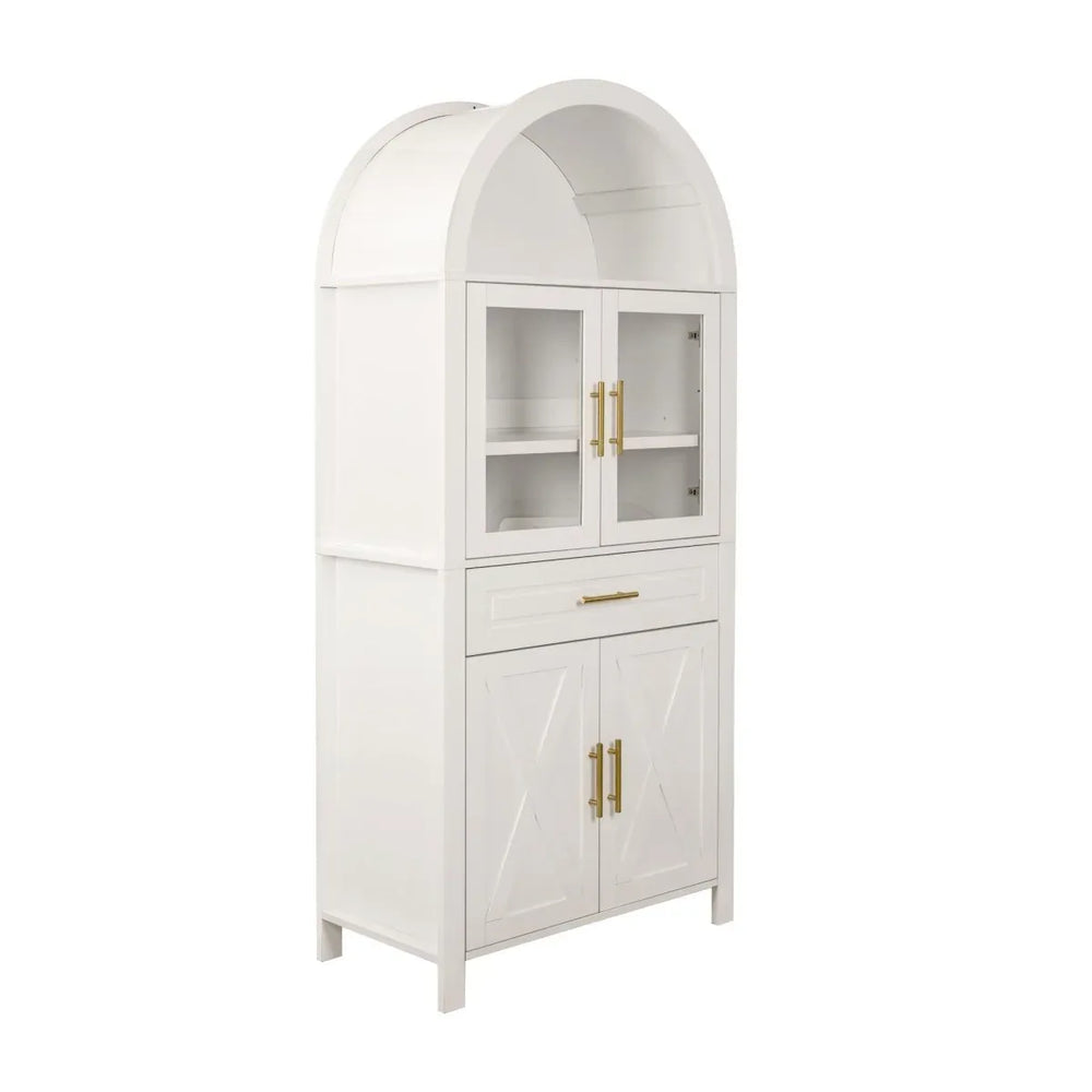 Bring timeless farmhouse charm and practical organization to your kitchen, living, or dining room with this elegant 71-inch (5.9 ft) tall arched pantry cabinet. Crafted from durable MDF, its white finish and arched tempered glass barn door showcase your favorite kitchenware while protecting them from dust. Inside, two adjustable shelves and built-in door racks offer versatile storage options perfect for bulk groceries, appliances, or delicate glassware. Thoughtfully designed removable middle feet stabilize the cabinet and protect your floors, while sturdy metal handles and high-quality hinges provide smooth, reliable use day after day. Whether placed in the kitchen, bathroom, or office, this stylish pantry cabinet combines beauty and functionality to keep your space organized and inviting. Upgrade your storage space and enhance your farmhouse décor today.