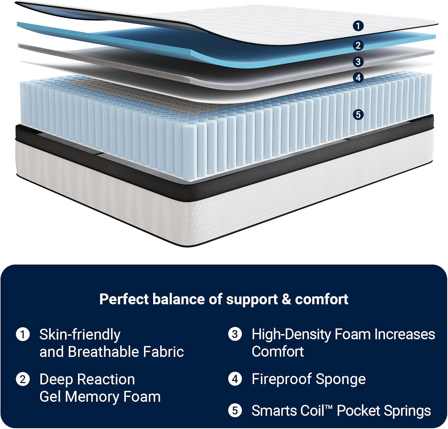 【Superior Motion Isolation】Individually wrapped Smarts Coil work with premium comfort foam to absorb movement, reducing motion transfer by 75%. Enjoy undisturbed sleep even with a restless partner.