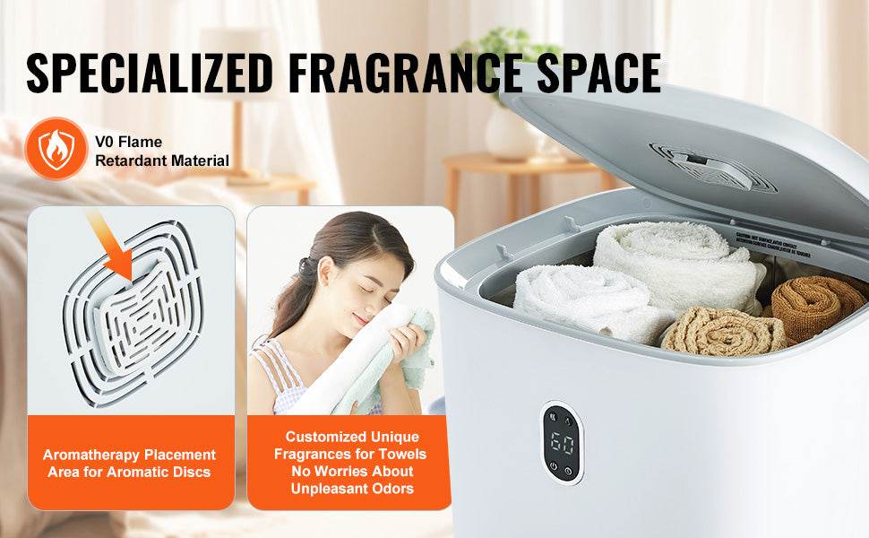 Customizable Fragrance: The smart towel warmer bucket is equipped with an aroma placement area, you can insert various fragrance discs or essential oils soaked pad to give your towels and blankets a unique scent. Enjoy a delightful aroma every time you use your towels and blankets.