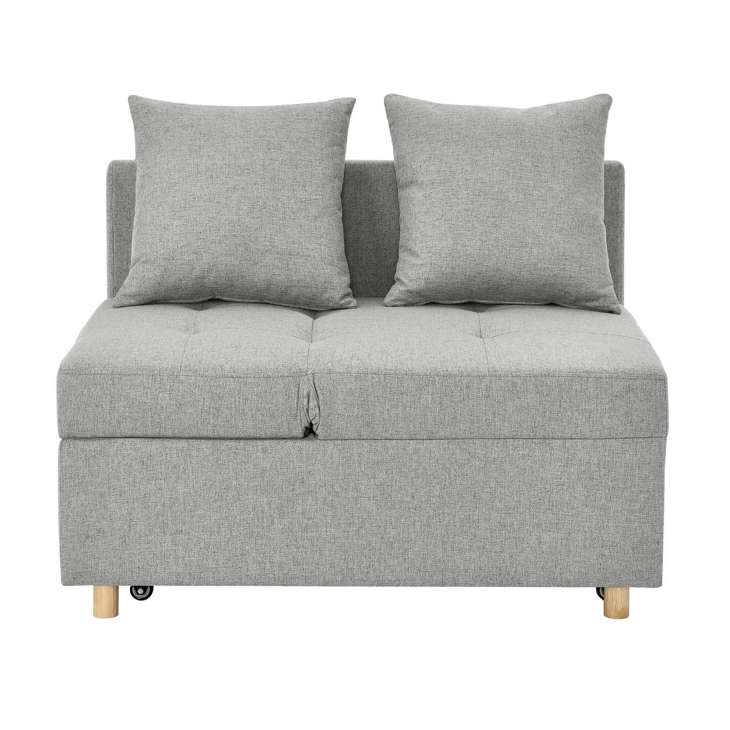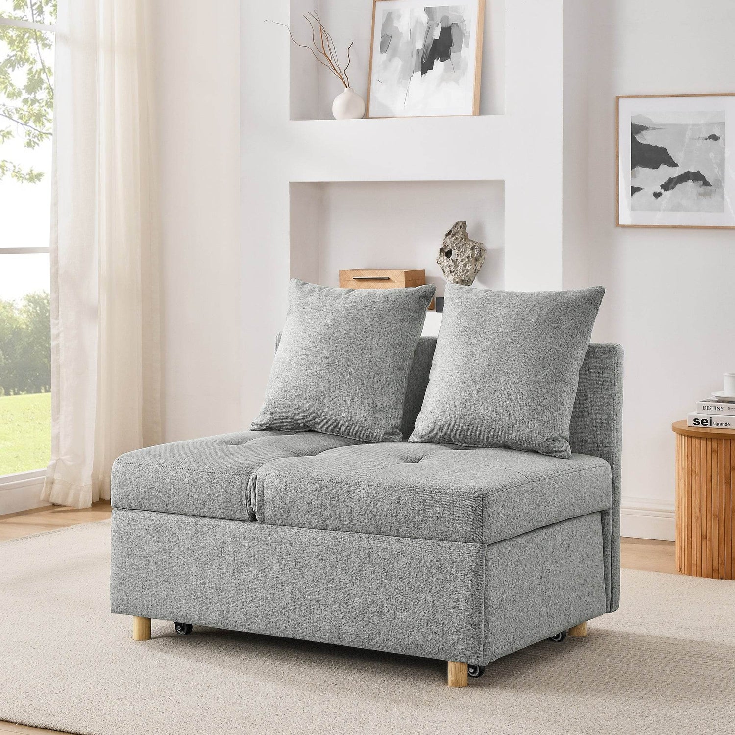 Designed for small spaces and versatile living, this convertible sleeper sofa chair seamlessly transforms from a soft, three-seat sofa into a comfortable pullout bed. Upholstered in breathable, wear-resistant grey linen, it combines modern style with lasting durability. The high-density foam cushioning ensures plush comfort whether you’re sitting or reclining, while the adjustable backrest allows you to find your perfect relaxation angle. Equipped with smooth-rolling wheels, this sofa is effortlessly portable—ideal for frequently rearranging your living room, bedroom, or office setup. The sturdy wood frame provides reliable support up to 300 lbs, making it a practical and stylish solution for dorms, apartments, or guest rooms. Easy to assemble and compact in size, this multifunctional sofa chair elevates your space and adapts to your lifestyle. Elevate your comfort and convenience today.