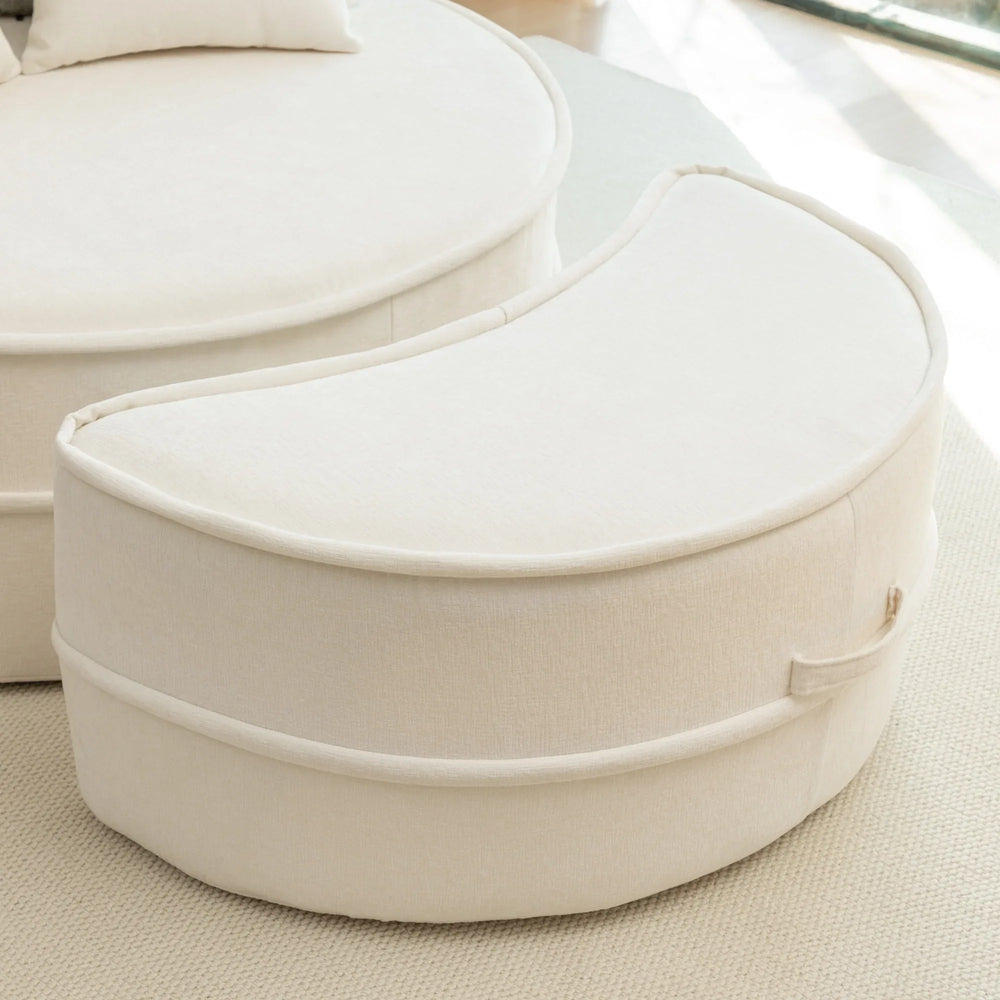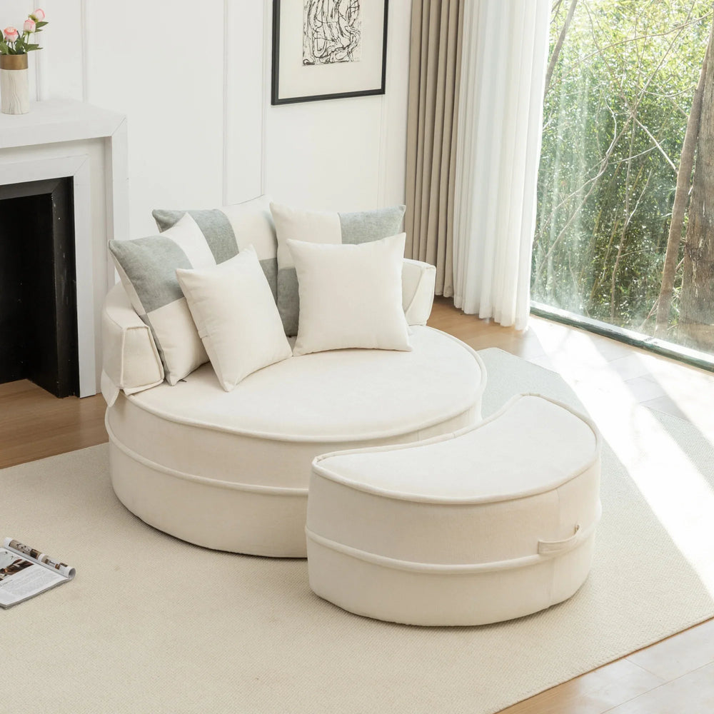 Elevate your living room or bedroom with this modern oversized accent chair featuring plush chenille upholstery in a versatile beige tone. Its round barrel design combined with square arms and a pillow back offers both style and exceptional comfort. The medium-soft seat cushion, supported by high-quality rebound sponge, ensures lasting no-sag comfort for lounging, reading, or unwinding. Included is a matching ottoman to relieve leg pressure, transforming this chair into a cozy retreat. With five plush pillows for customizable support, you can create the perfect lounging setup. At approximately 64 inches long and 48 inches wide, this chair with ottoman provides generous seating space while maintaining a sleek profile. Ready to enhance your primary living space, it arrives hassle-free and requires no assembly—simply fluff the cushions and enjoy your new favorite relaxation spot. Add this stylish velvet lounge chair to your home and elevate your comfort today.