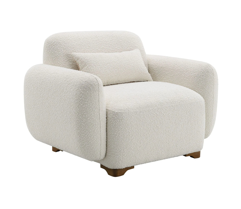 This contemporary accent chair features soft beige boucle upholstery, plush cushioning, and a durable wooden frame with pocket coil support, offering stylish comfort for everyday use. Included toss pillow and easy assembly make it ideal for modern living rooms.
