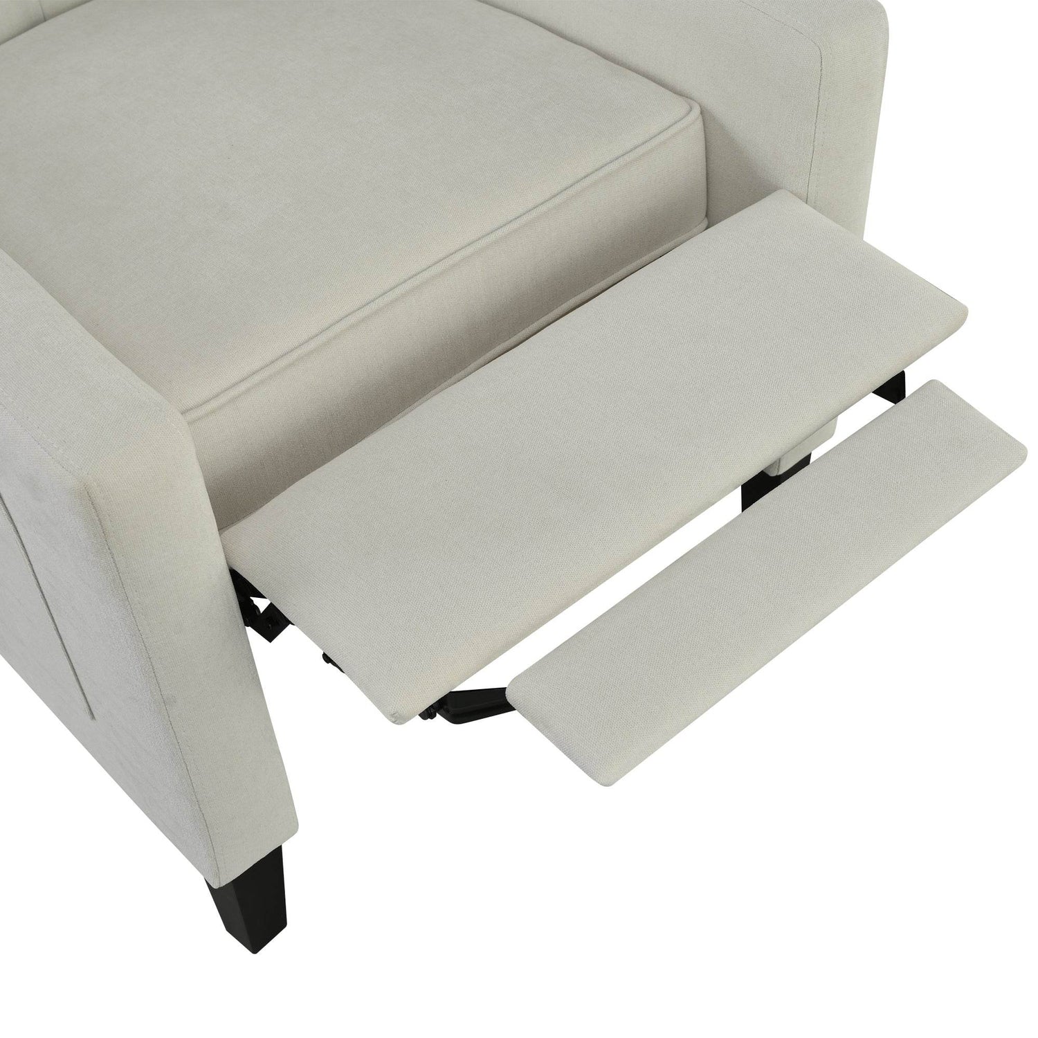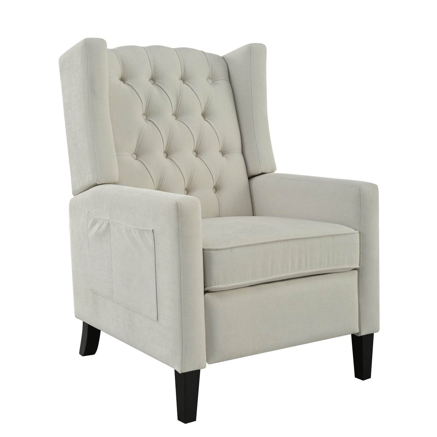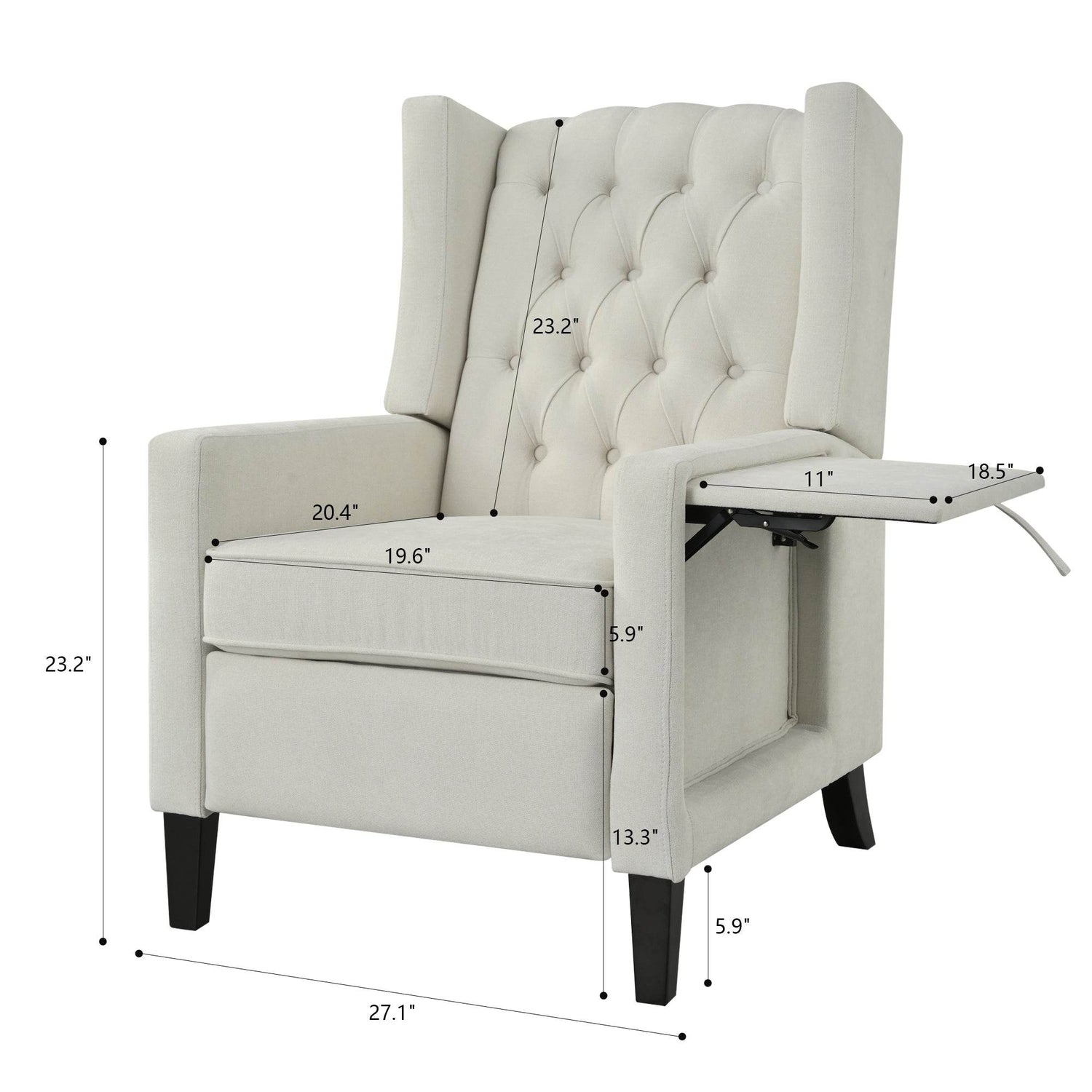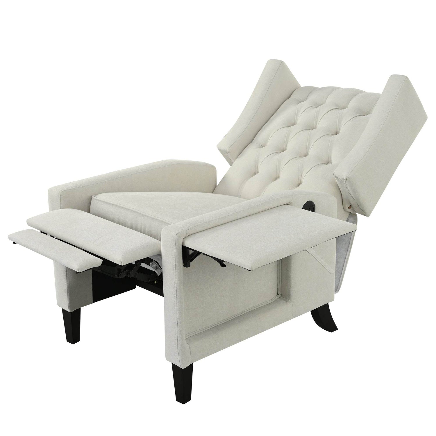 Upgrade your living space with this stylish Beige polyester reclining chair, featuring a button-tufted diamond design that blends mid-century charm with modern comfort. The high-density foam cushions provide plush support for long hours of relaxation, while the sturdy solid wood frame with birch legs ensures durability and stability. Enjoy the convenience of a foldable side table with a 50-pound capacity, perfect for holding drinks or books, plus built-in USB charging ports to keep devices powered. Effortlessly recline and extend the footrest for personalized lounging, ideal for living rooms, bedrooms, dorms, or offices. Its compact dimensions (29" W x 35" D x 40" H) make it a perfect fit even in small spaces. Elevate your relaxation today with this versatile pushback recliner chair.