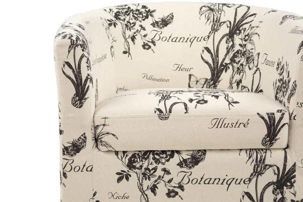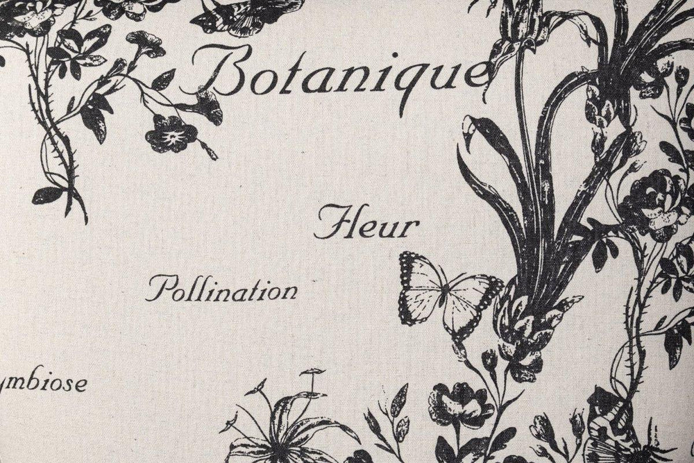 Main Material: Fabric upholstery featuring vintage-inspired script and botanical sketches