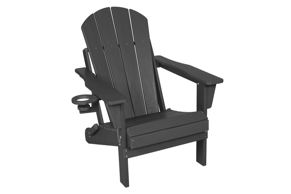 Durable gray HDPE Adirondack chair features a large seat, tall backrest, wide armrests, and integrated cup holder for outdoor relaxation. Weather-resistant and foldable for easy storage, this garden chair supports up to 350 lbs and suits all-season use.