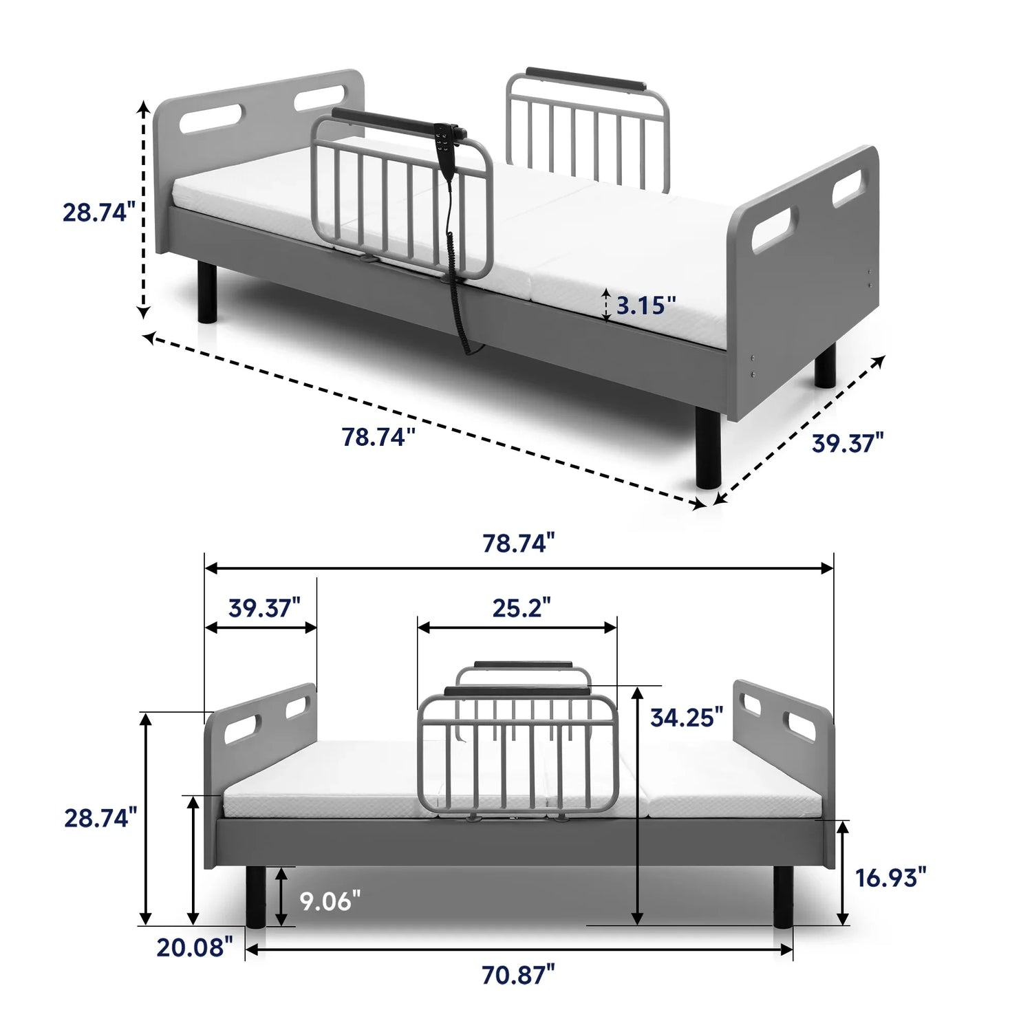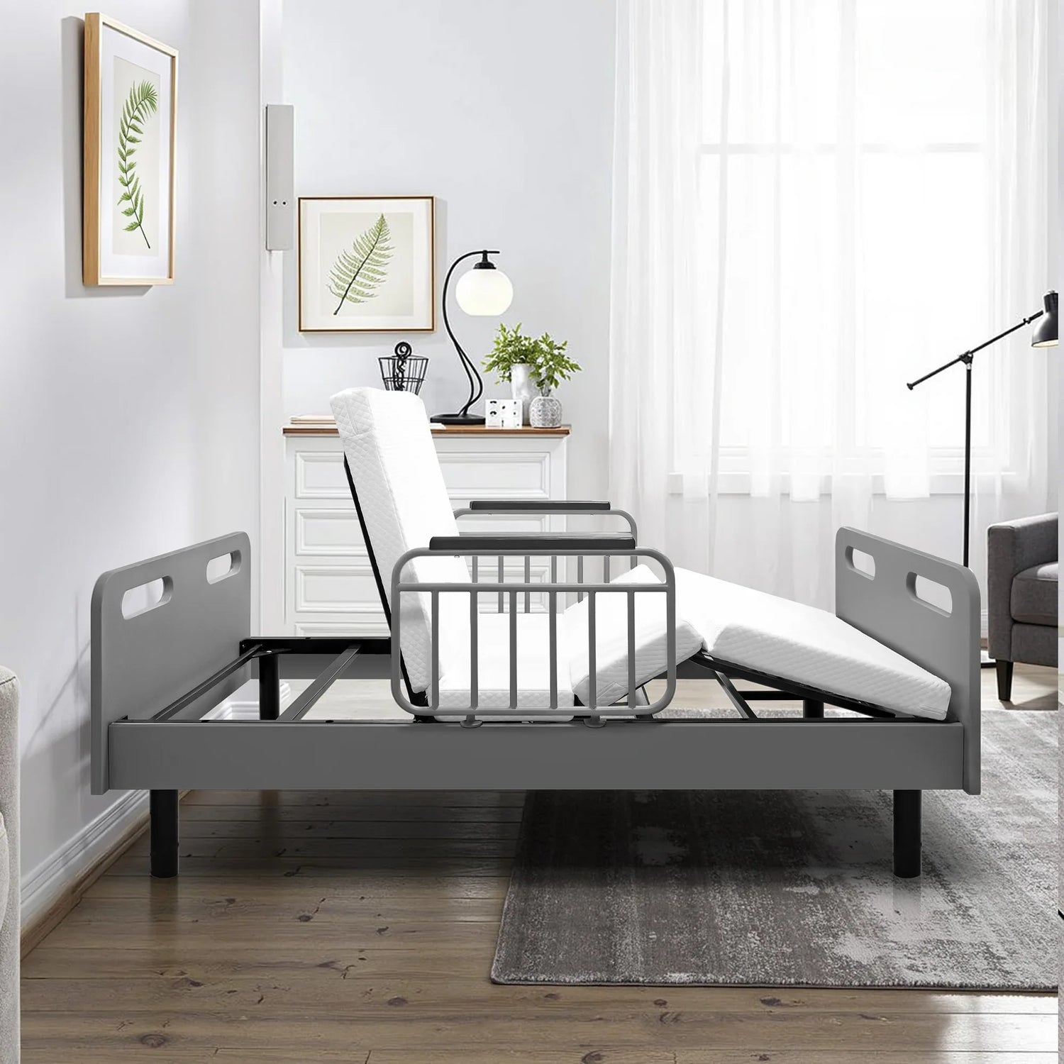Designed for home care and recovery, this electric adjustable hospital bed offers customizable support to enhance comfort and mobility. Featuring a high-strength carbon steel frame and durable MDF panels in sleek gray and white, the bed ensures stability and style. Easily adjust the head and leg positions with a wired remote to find the perfect angle for sleeping, reading, or relaxation. The premium foldable memory foam mattress cushions pressure points and promotes spinal alignment, while the removable, machine-washable cover adds convenience. Safety guard rails provide added peace of mind for seniors or those recovering from surgery. Ultra-quiet operation keeps your environment peaceful, making this bed ideal for daily living or post-operative care. Elevate your home healthcare experience today.
