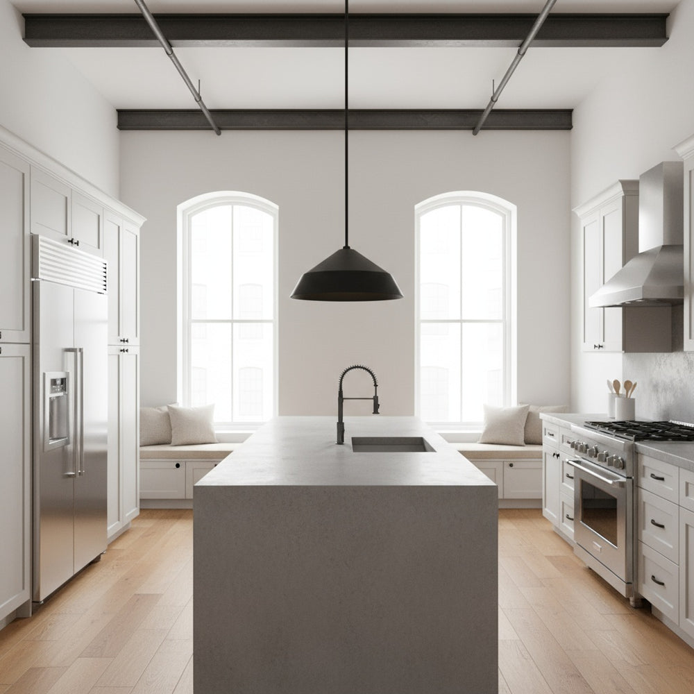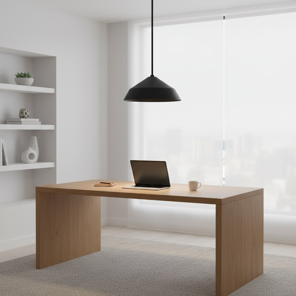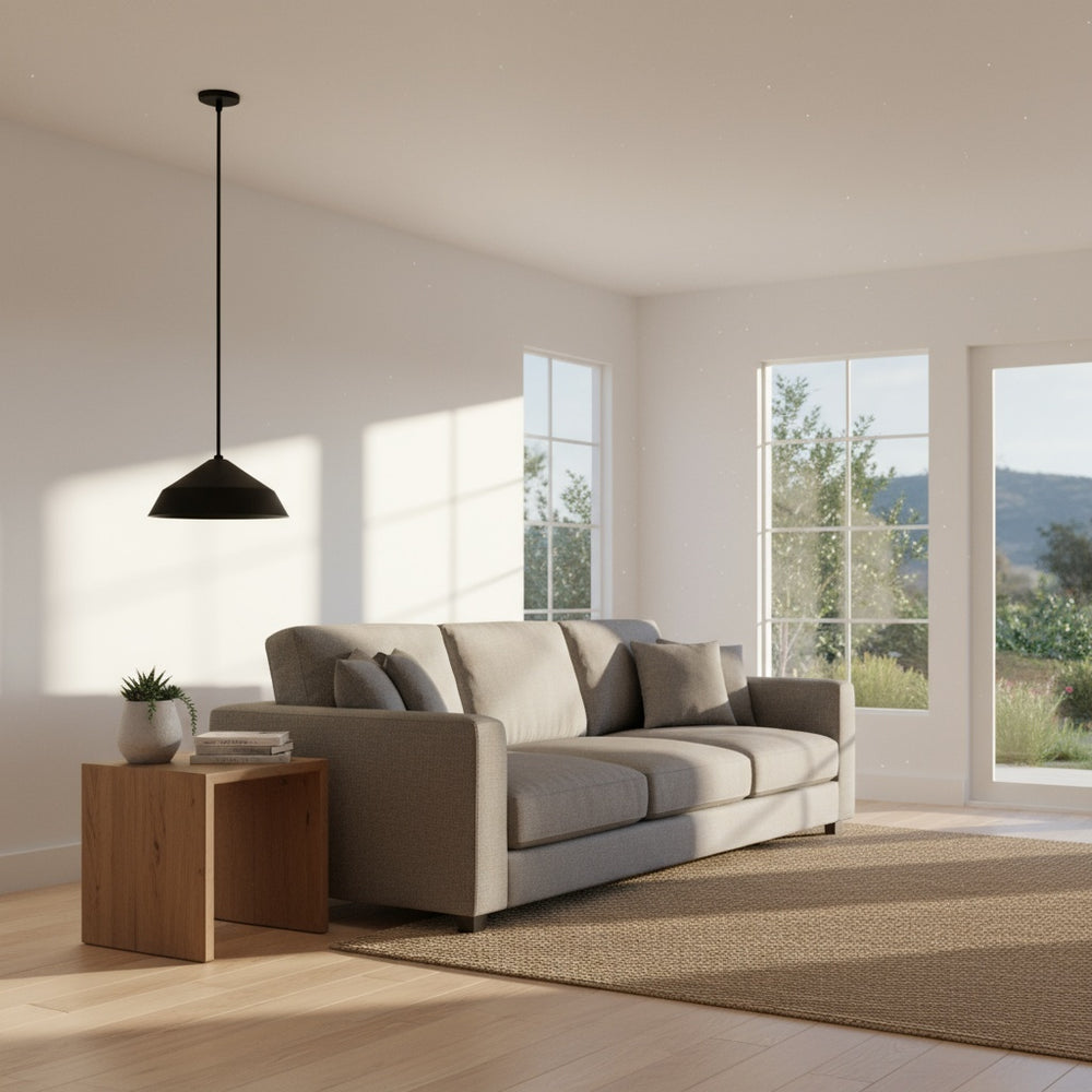 Omega Lifestyles black steel pendant light features energy-smart, bright LED with 900 lumens at 20W, dimmable across five color temperatures, an etched white glass diffuser, and easy installation, ideal for modern indoor lighting in dry or damp spaces.