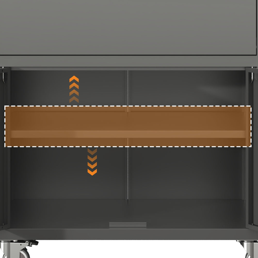 Sturdy metal tool cabinet features a cold-rolled steel frame with black and gray powder-coated finish, offering secure storage with lockable doors, spacious drawer, adjustable shelves, and 360° lockable caster wheels for easy mobility in garages, workshops, and offices.