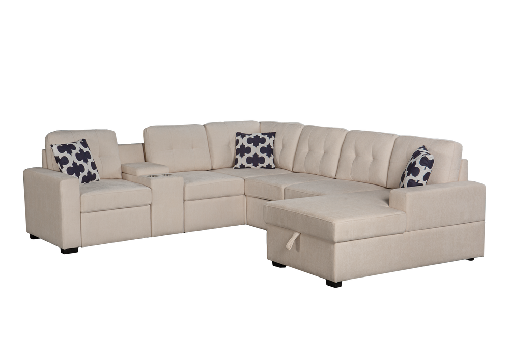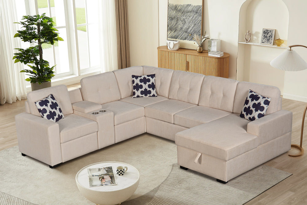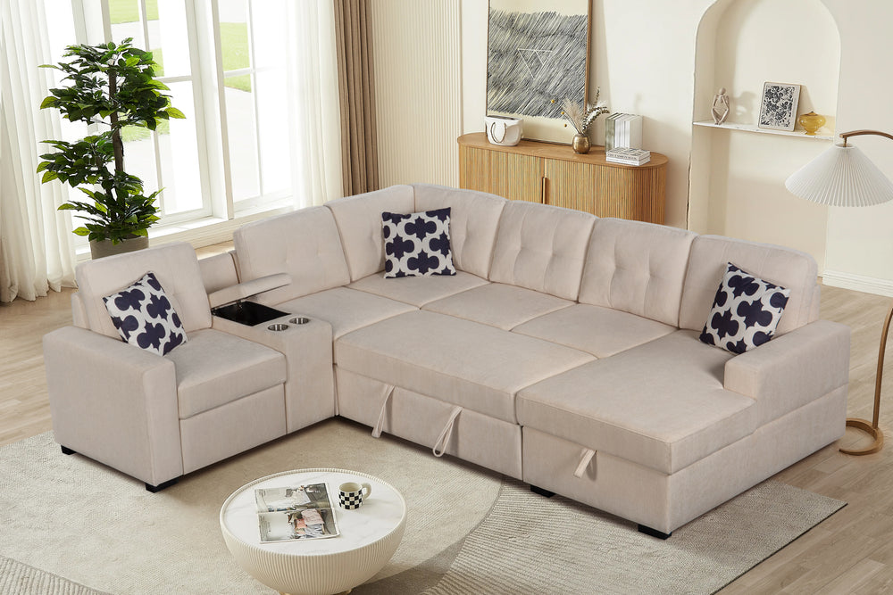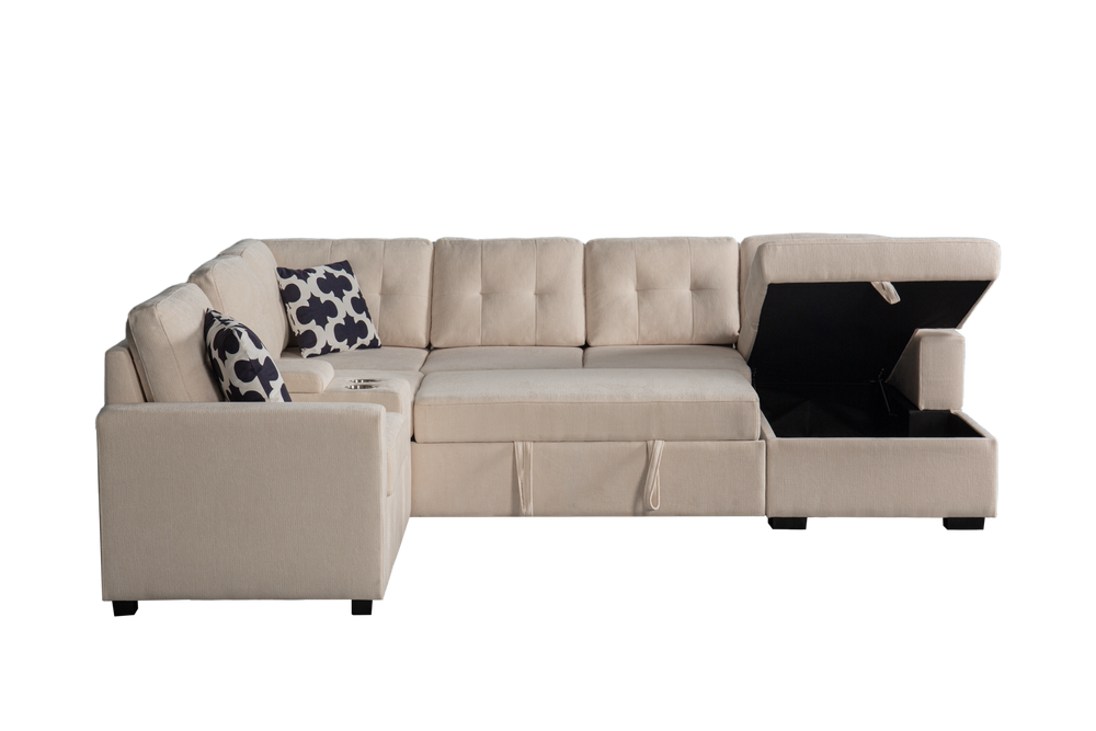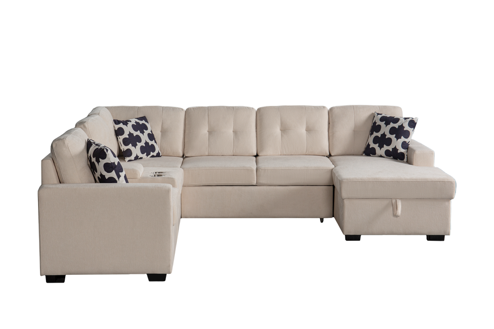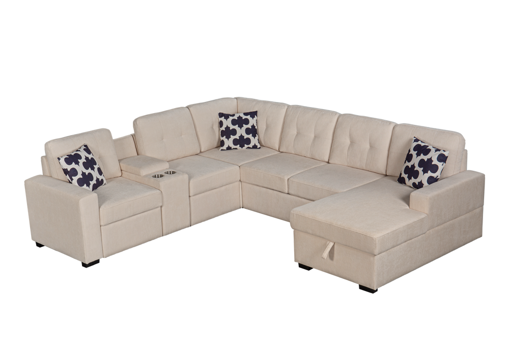 Upgrade your living space with this stylish and practical U-shaped sectional sofa designed for ultimate comfort and convenience. Upholstered in soft beige chenille fabric and filled with supportive foam, it offers medium-soft seating perfect for relaxing or entertaining guests. The wooden frame ensures lasting durability, while the modular design allows flexible arrangement to suit any room layout or occasion. With built-in stainless steel cup holders and multiple hidden storage compartments—including under-seat drawers and lift-up storage—you’ll keep essentials close and clutter-free. Included patterned accent pillows add both comfort and visual appeal, making this sectional an inviting centerpiece for your primary living area. Elevate your home’s functionality and style today.