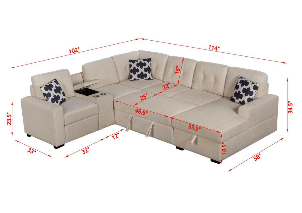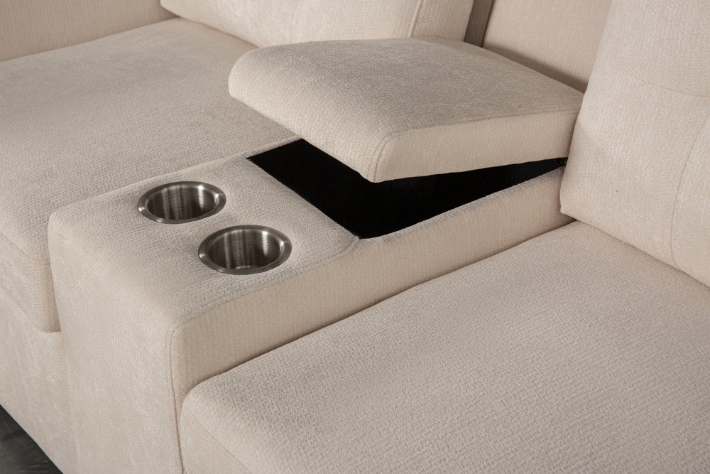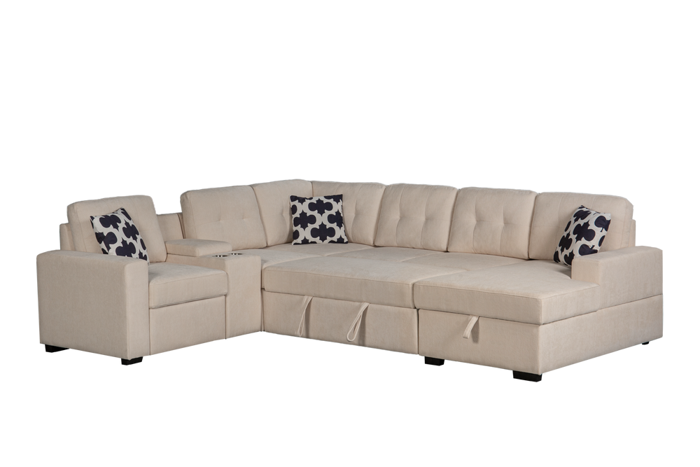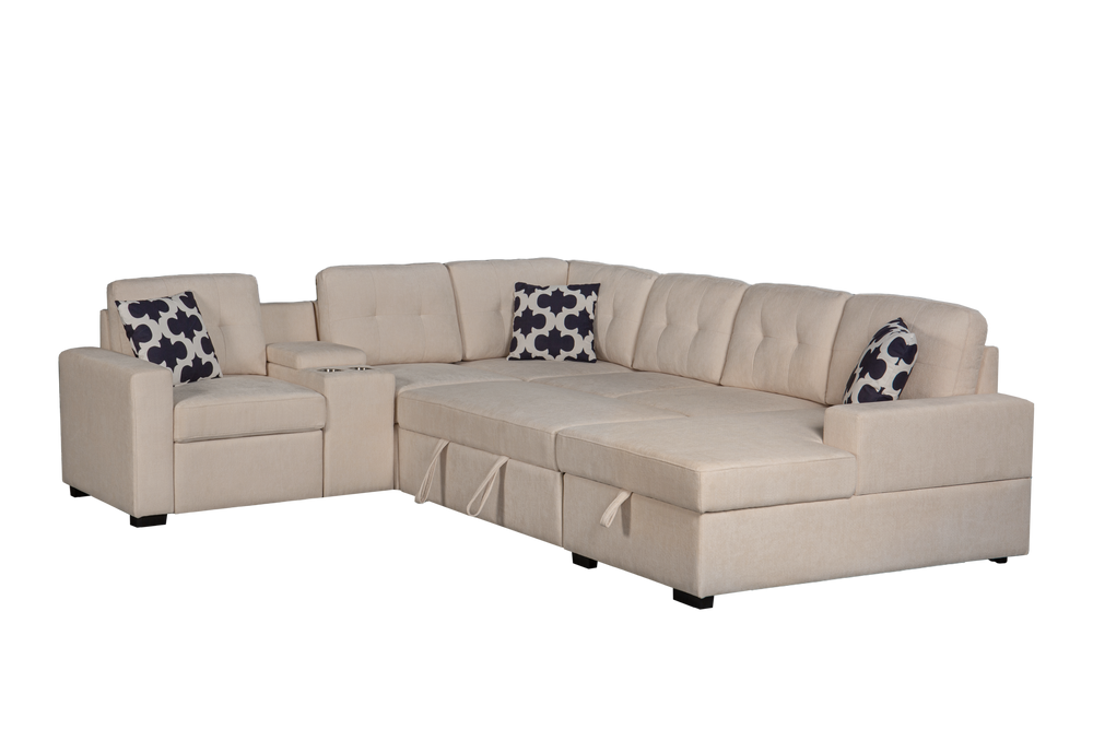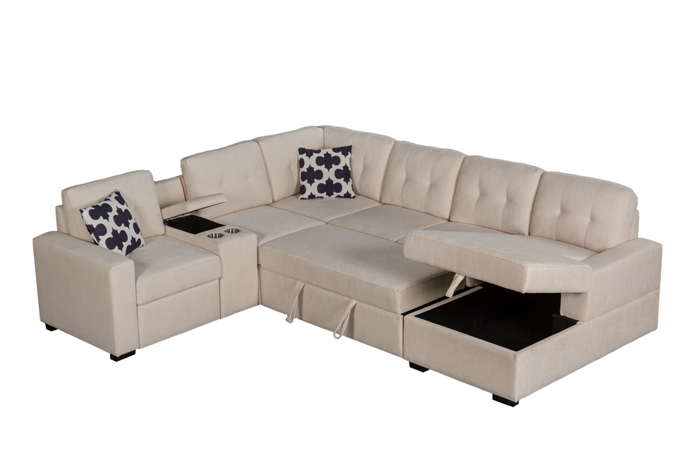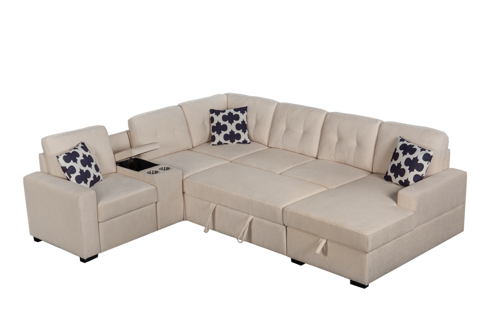 Upgrade your living space with this stylish and practical U-shaped sectional sofa designed for ultimate comfort and convenience. Upholstered in soft beige chenille fabric and filled with supportive foam, it offers medium-soft seating perfect for relaxing or entertaining guests. The wooden frame ensures lasting durability, while the modular design allows flexible arrangement to suit any room layout or occasion. With built-in stainless steel cup holders and multiple hidden storage compartments—including under-seat drawers and lift-up storage—you’ll keep essentials close and clutter-free. Included patterned accent pillows add both comfort and visual appeal, making this sectional an inviting centerpiece for your primary living area. Elevate your home’s functionality and style today.