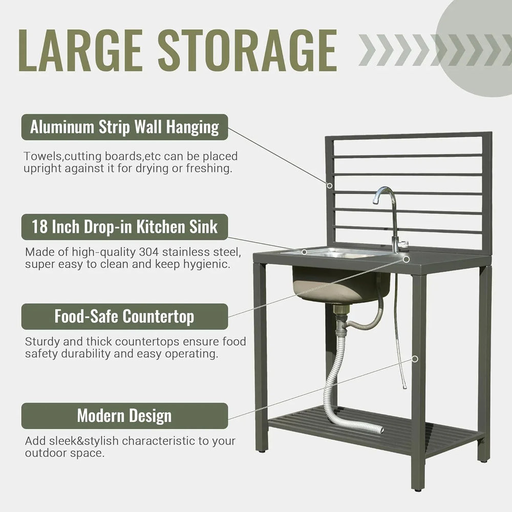 Outdoor Kitchen Island features a corrosion-resistant powder-coated aluminum frame, food-safe countertop, stainless steel sink with faucet and drainboard, plus freestanding storage shelves with protective cover and adjustable leveler feet for stable, year-round outdoor use.