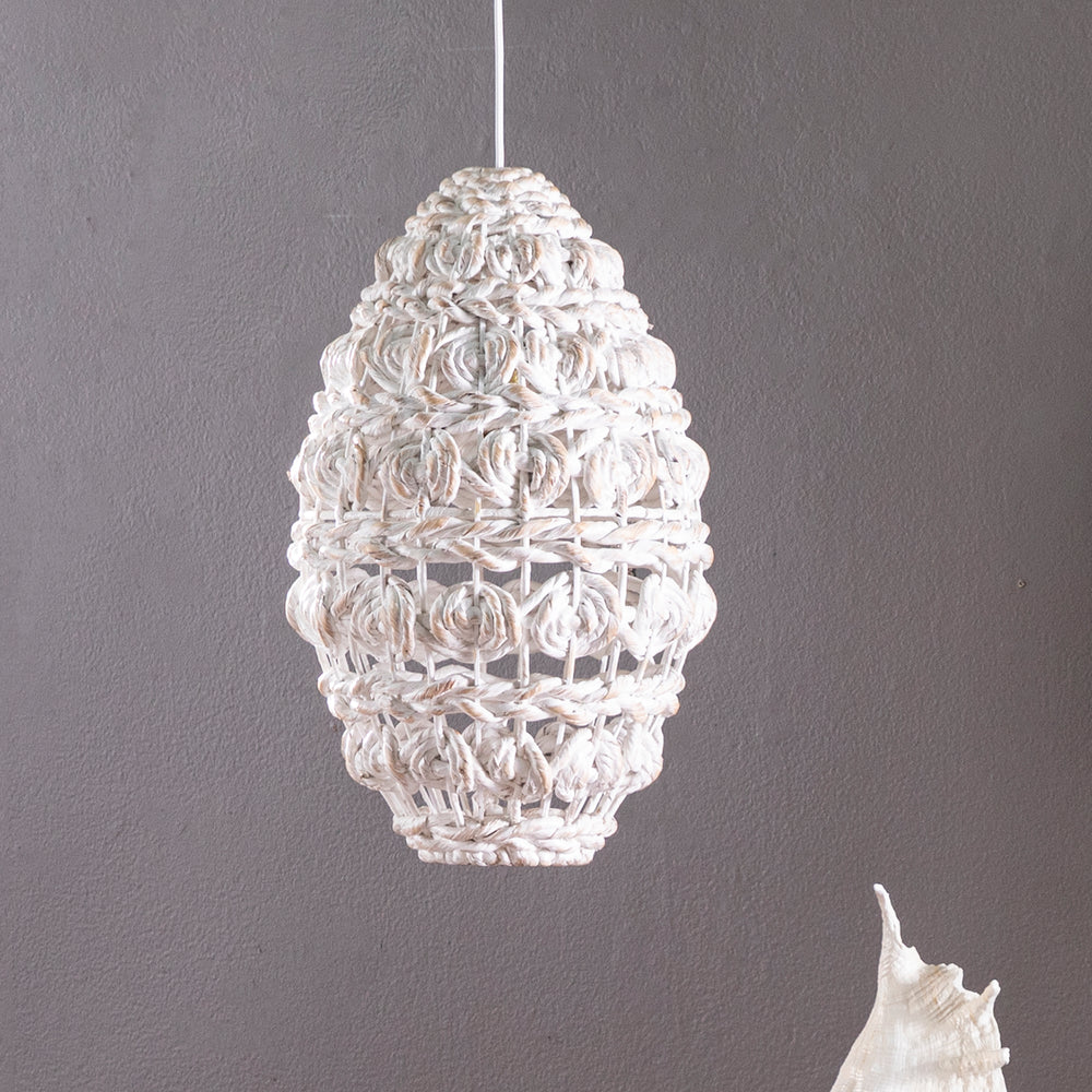 This white washed woven pendant lamp shade features a unique natural fiber frame with a sturdy iron interior ring, offering stylish lighting for kitchens, bars, or entryways while adding a coastal, eclectic vibe to your living space.