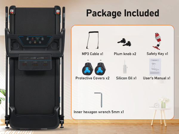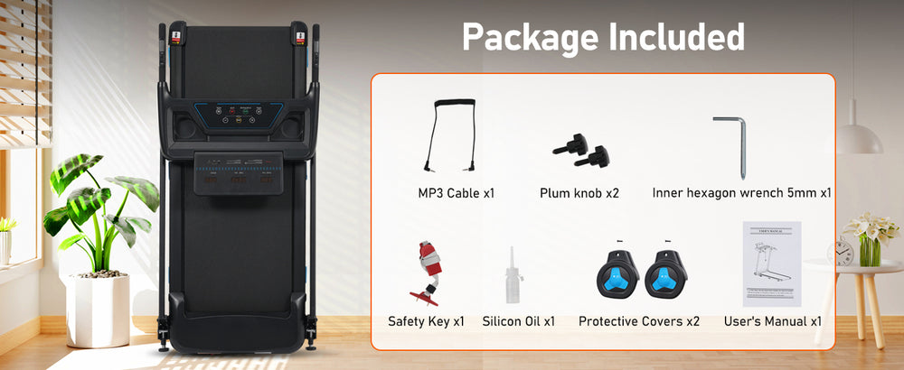 Package Includes: Treadmill, safety handrails, user manual, assembly tools