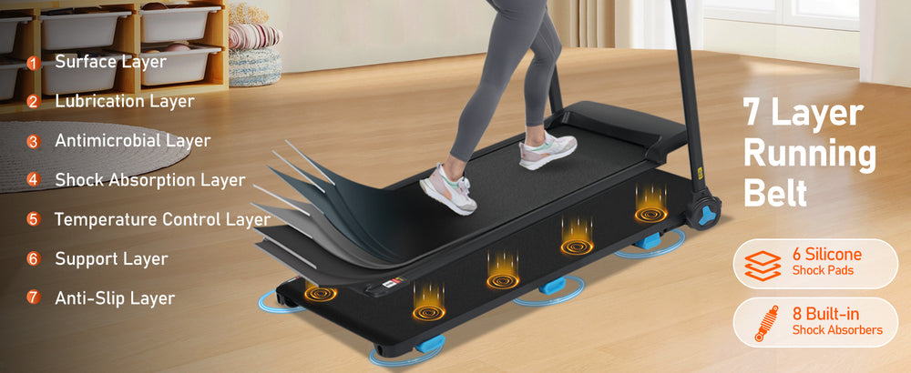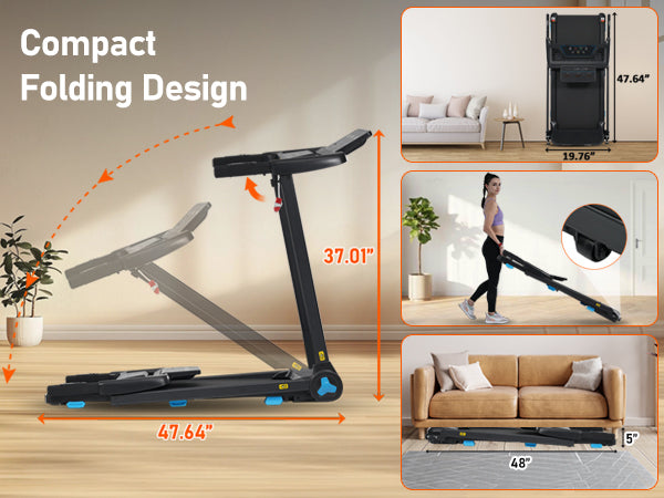Experience versatile indoor fitness with this compact, foldable treadmill designed for small spaces. Powered by a robust 3.0HP motor, it delivers smooth speeds up to 10MPH and features an 8% manual incline to maximize calorie burn and enhance cardiovascular health. The spacious 41.7" x 15.4" running belt offers ample room for comfortable strides regardless of your physique. Advanced shock absorber technology reduces joint impact by 30%, ensuring safer and quieter workouts in apartments or offices. The multi-function console with three adjustable LED screens lets you easily monitor real-time stats like heart rate, distance, speed, and calories burned. Plus, integrated Bluetooth speakers and USB/Type-C charging ports keep you motivated and connected throughout your session. Quick to assemble and designed for durability with a sturdy metal frame, this treadmill is your ideal fitness partner for home or gym use. Take your fitness routine to the next level—start your journey today.