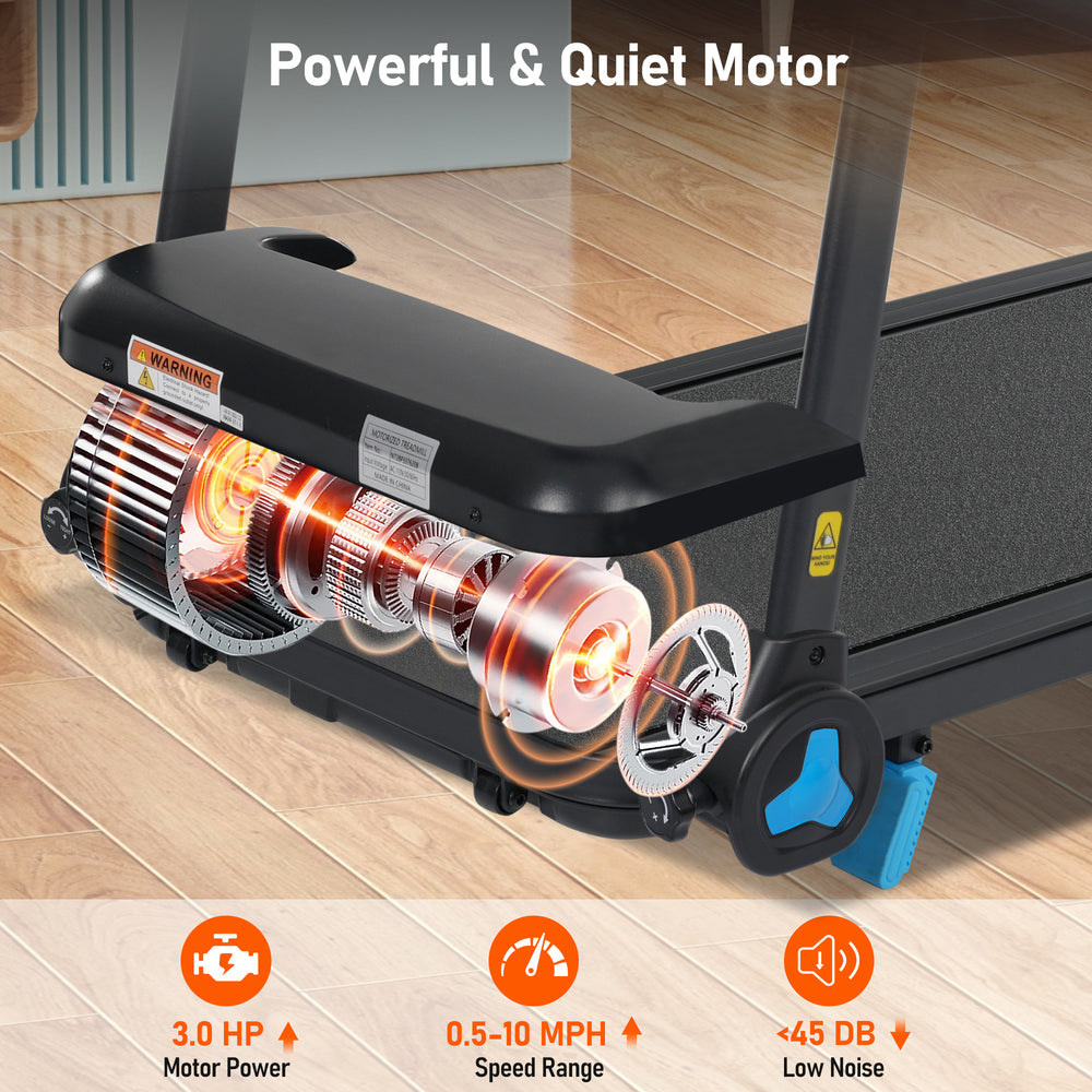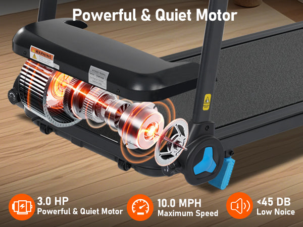 • Powerful 3.0HP Motor: Supports speeds from 0.5 to 10 MPH for walking, jogging, and running.