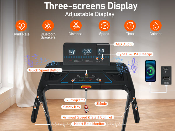 • Multi-Function Console: Displays time, distance, speed, calories, and heart rate on three adjustable LED screens.