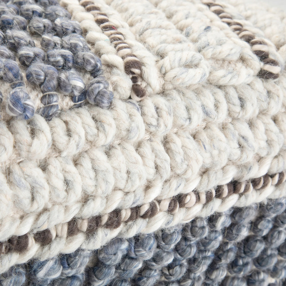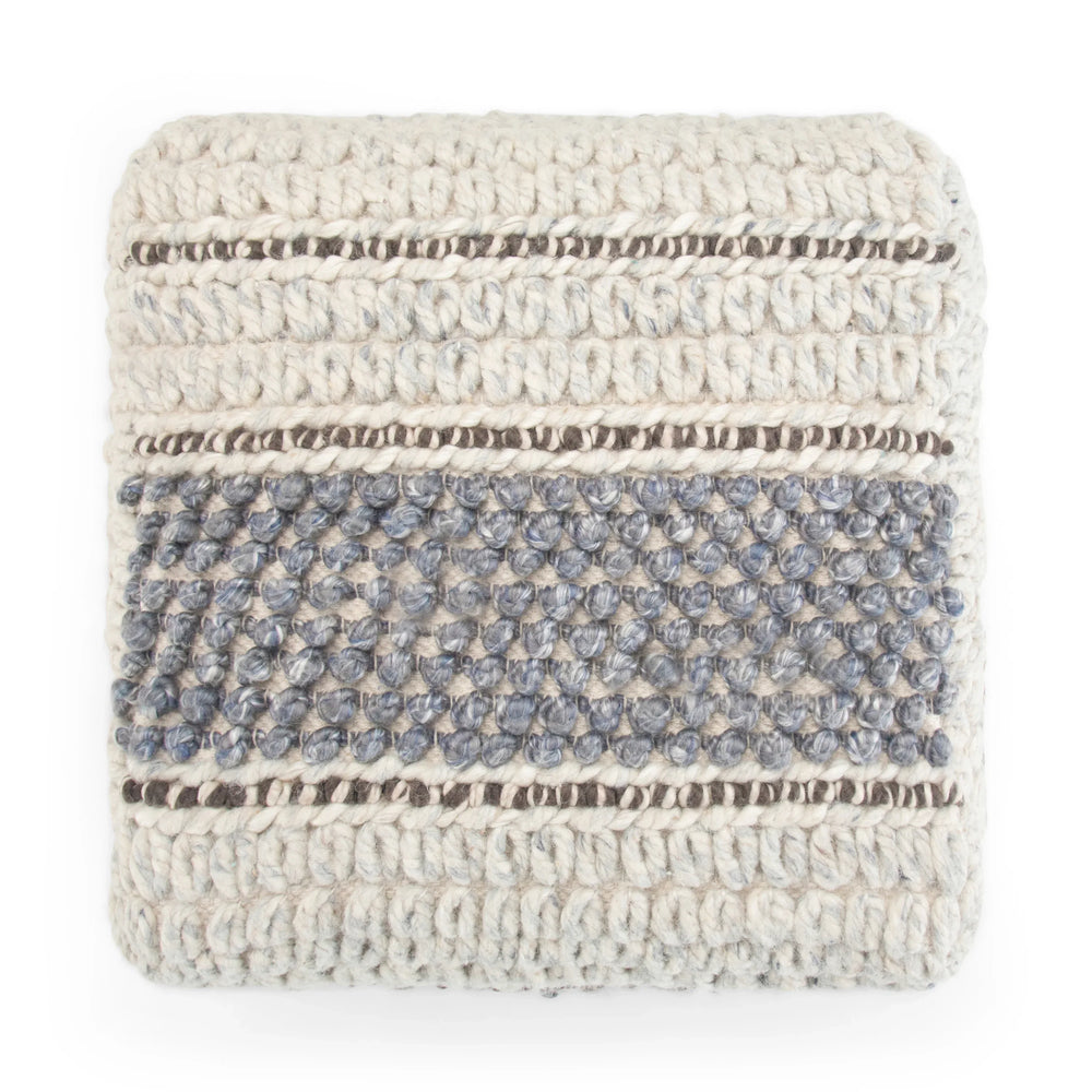 Handcrafted blue and natural woven pouf made with wool and cotton fabric, filled with dense polystyrene beads for sturdy, supportive seating. Versatile square pouf ideal as a footstool or accent in living, family, or bedrooms, fully assembled and durable.